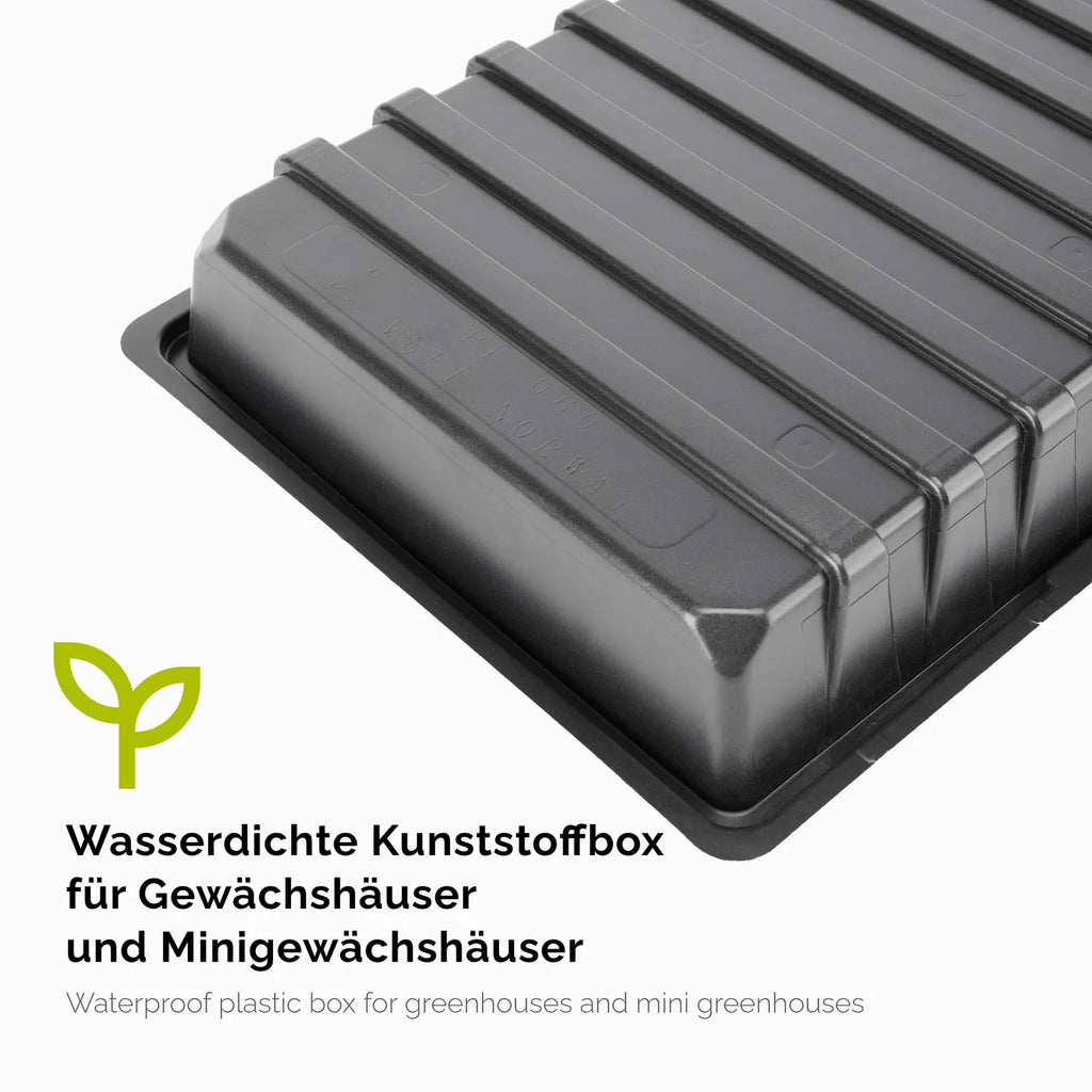 Die Schale ist aus einer hochwertigen Kunststoffbox gefertigt, was sie wasserdicht und leicht zu reinigen macht. Sie ist optimiert für die effiziente Bewässerung von Setzlingen und Stecklingen, was die Anzucht von Zimmerpflanzen und anderen Gewächsen im Innenbereich erleichtert. Die Anzuchtplatte innerhalb des Sets bietet eine stabile Basis für Anzuchttöpfe und Pflanzentöpfe und hilft, optimale Bedingungen für das Wachstum zu schaffen.