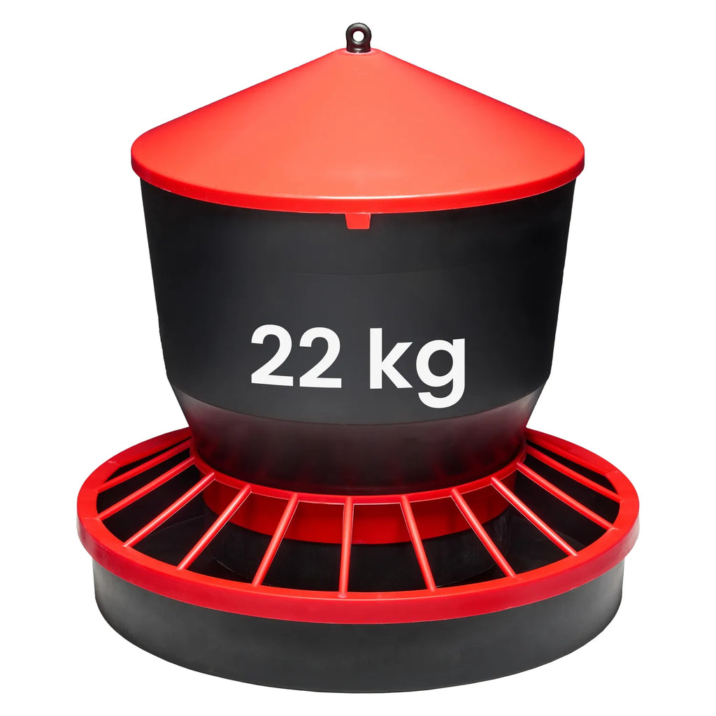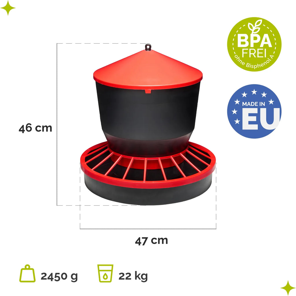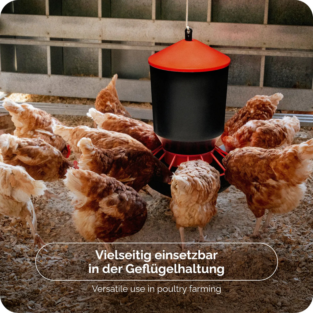 Der Garronda Hühnerfutterautomat ist die ideale Lösung für die zuverlässige Fütterung von Hühnern, Küken, Wachteln und anderem Geflügel – sowohl in Kleinställen als auch in der Freilandhaltung. Als Futterautomat für Huhn ist er in Größen mit 3, 6, 10 oder 22 kg Fassungsvermögen erhältlich und bietet ausreichend Platz für Körnerfutter, Legehennenfutter oder Kükenfutter.