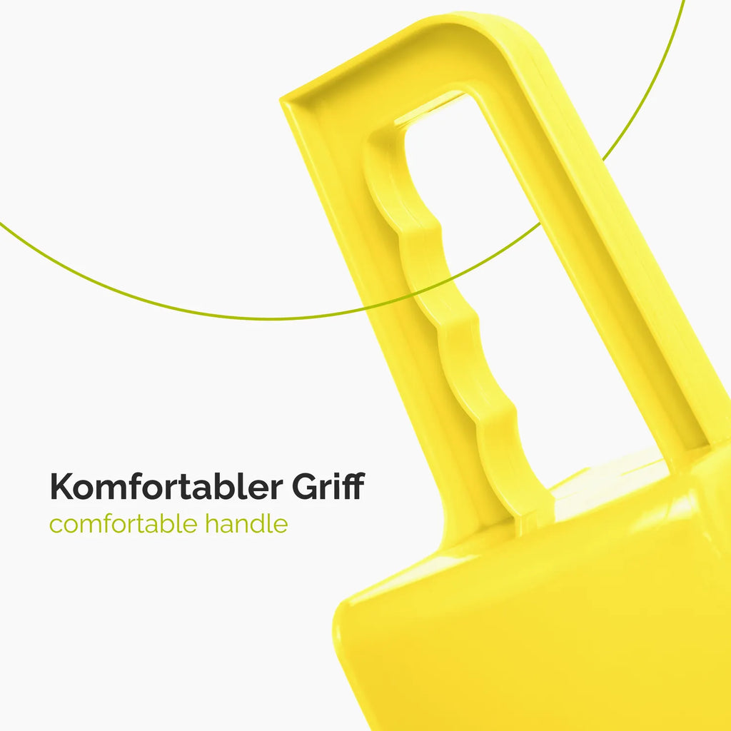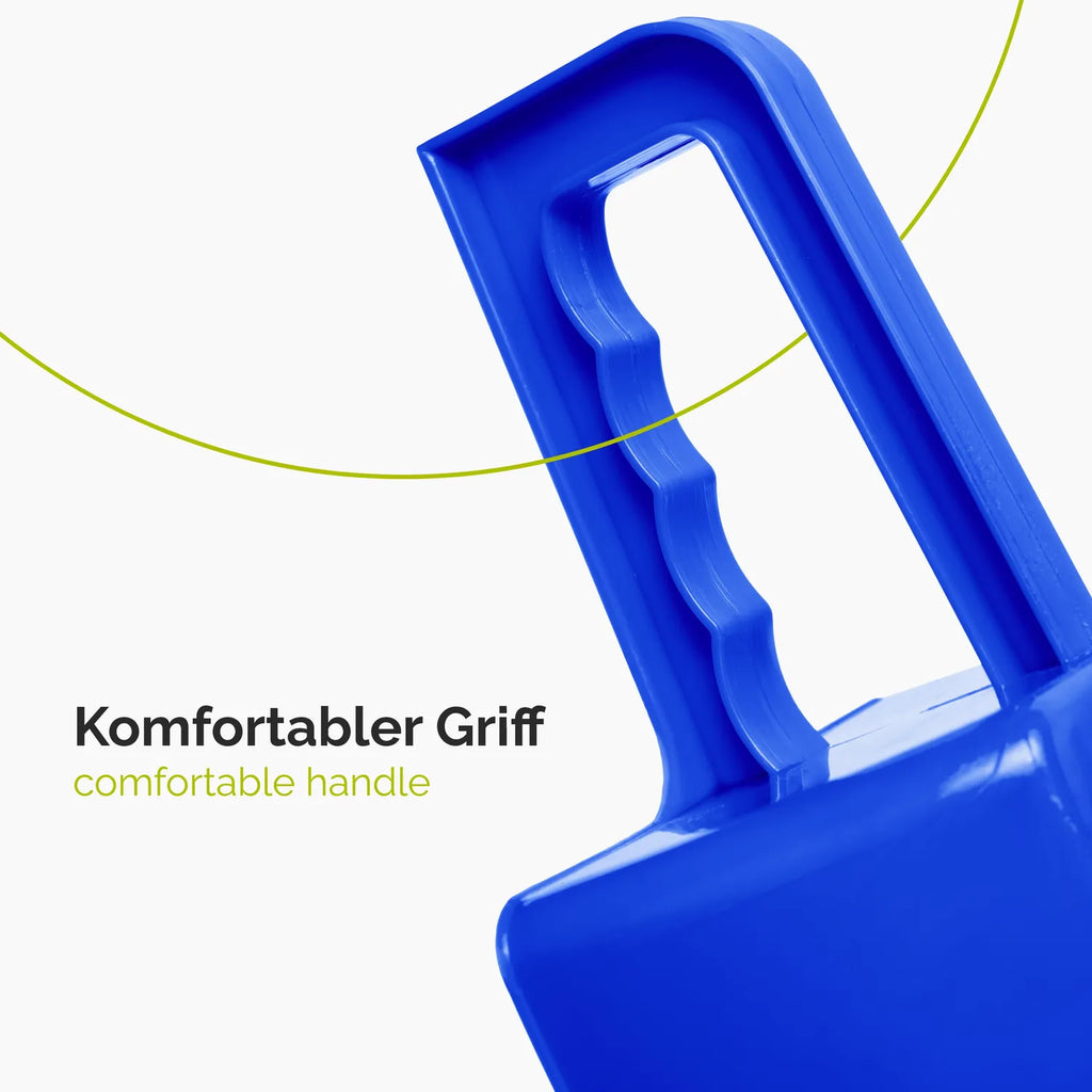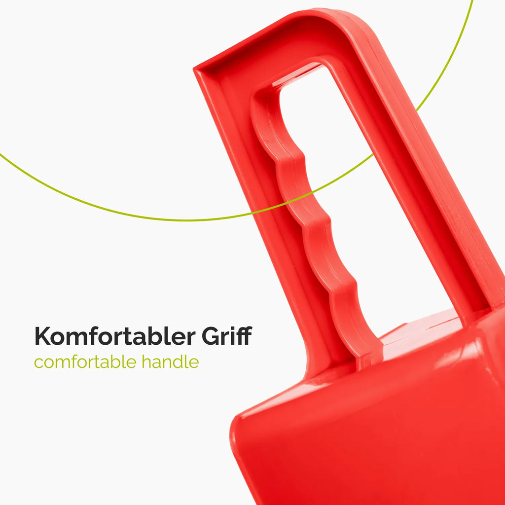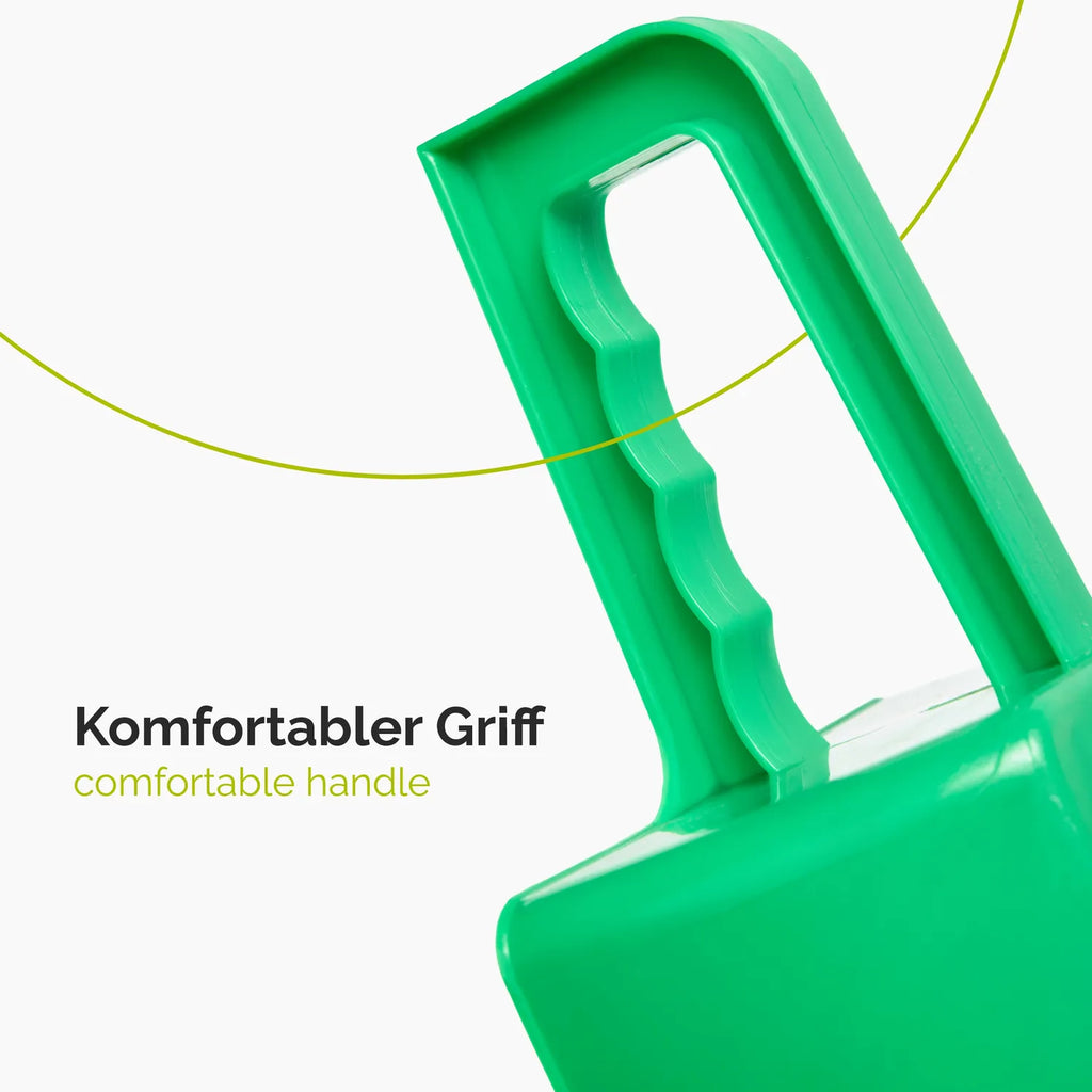 Die breite Öffnung und das hohe Füllvolumen ermöglichen eine einfache und schnelle Aufnahme von Futter, Pellets, Granulat, Streu oder Dünger. Dank der ergonomisch geformten Griffmulden liegt die Schaufel sicher in der Hand – selbst bei längerer Nutzung. Kein Verrutschen, kein Streuverlust.