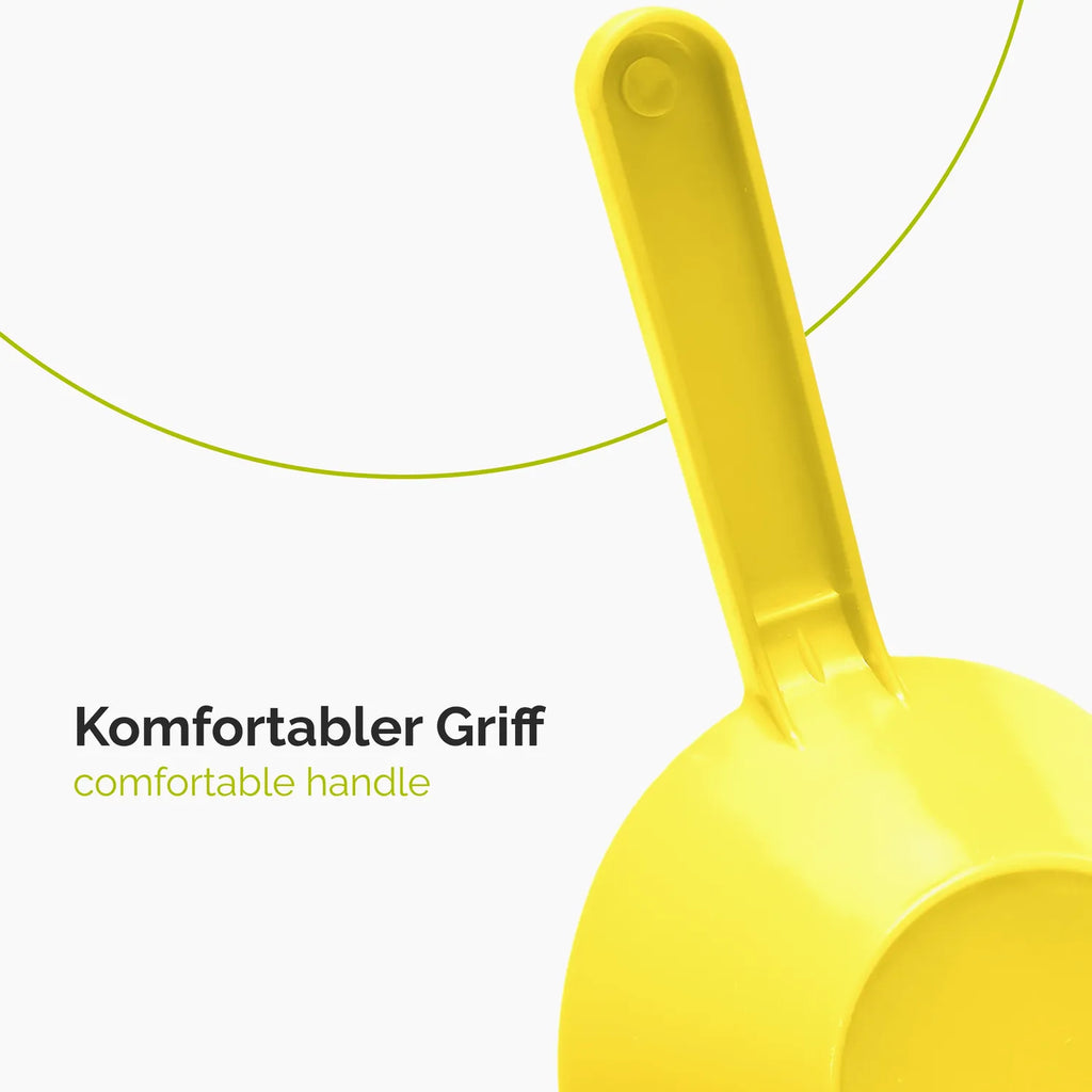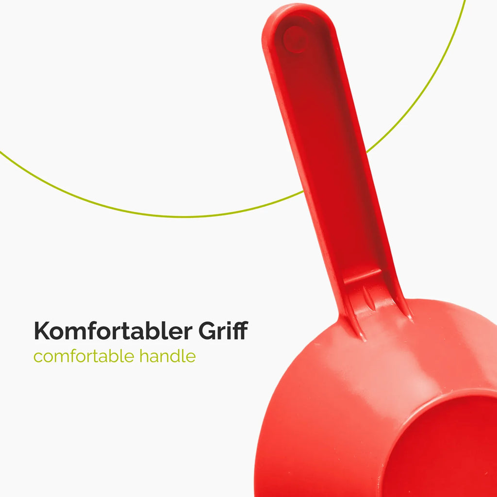 Wählen Sie zwischen zwei Größen: ca. 500 g (Maße: 335 × 115 × 70 mm) oder ca. 1000 g (Maße: 350 × 145 × 90 mm) – für noch mehr Flexibilität bei der Portionierung. Egal ob 500g für kleinere Mengen oder Futterschaufel 1000g für größere Portionen – mit Garronda dosieren Sie präzise und ohne Kraftaufwand.