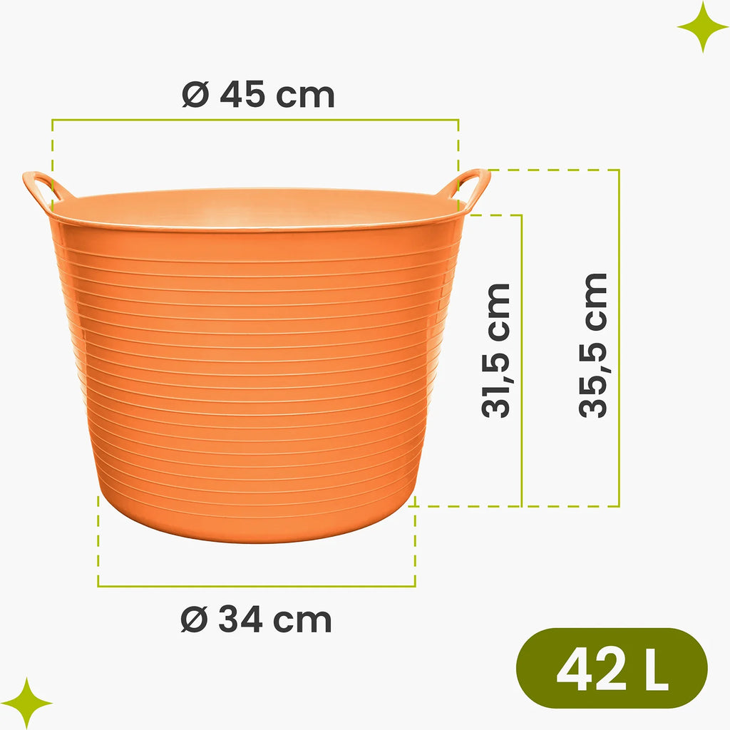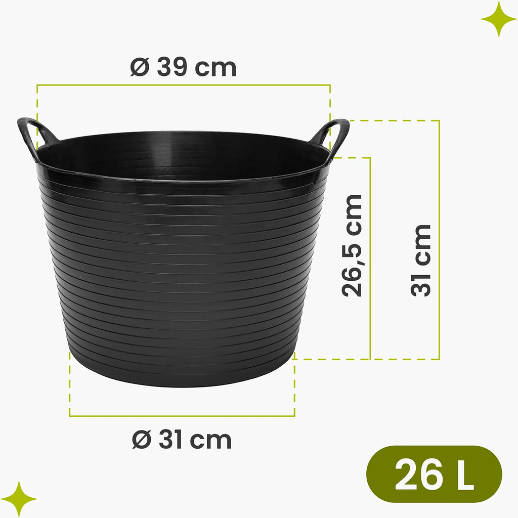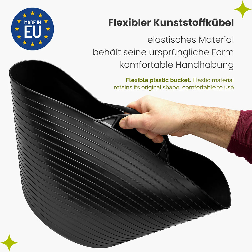 Die integrierten Griffe erleichtern das Tragen und Umfüllen von Materialien, während die glatten Innenflächen eine schnelle Reinigung ermöglichen. Mit den beiden praktischen Größen von ca. 40 × 32 cm (26 L) und 50 × 36 cm (42 L) bietet der Kübel genügend Kapazität für Gartenabfälle, Werkstattmaterial, Zubehör oder Haushaltsartikel. Seine universelle Form begünstigt sowohl die Nutzung im Garten als auch in Garage, Keller oder Werkstatt.