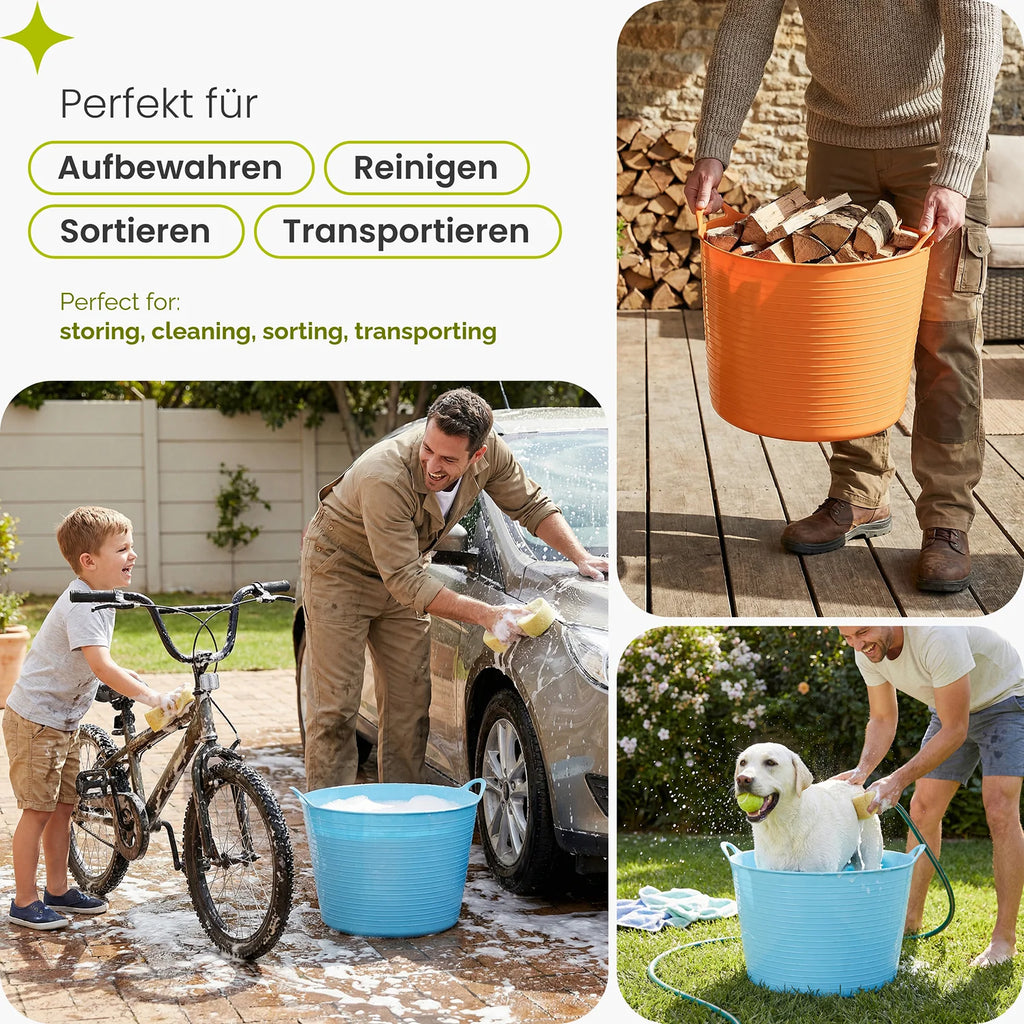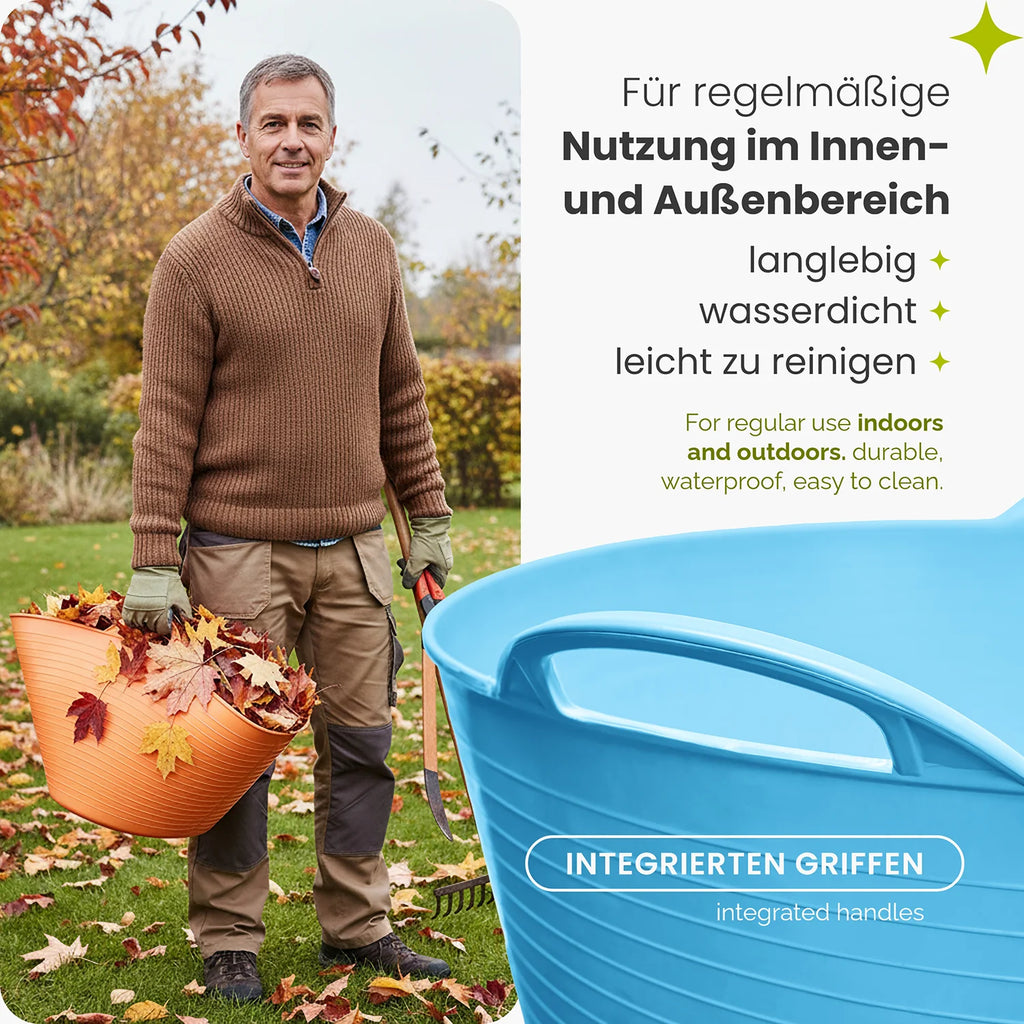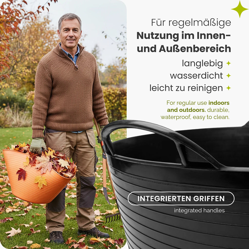 Ob beim Sammeln von Laub, Transportieren von Erde, Sortieren von Werkzeugen oder Aufbewahren von Alltagsgegenständen – der Behälter unterstützt eine geordnete und effiziente Arbeitsweise. Durch seine robuste Materialmischung bleibt er elastisch und belastbar, was ihn zu einer praktischen Ergänzung für Renovierungsarbeiten, Lagerorganisation oder die tägliche Nutzung im Haushalt macht.