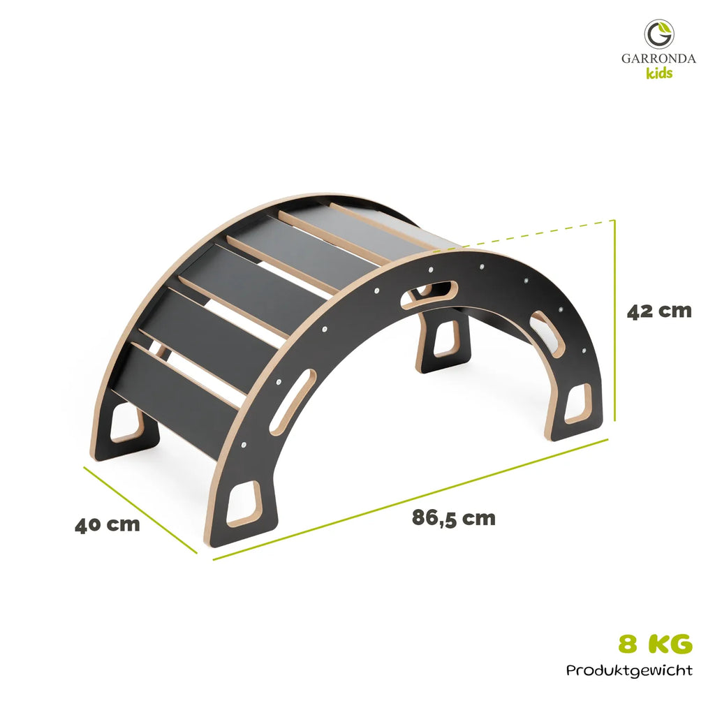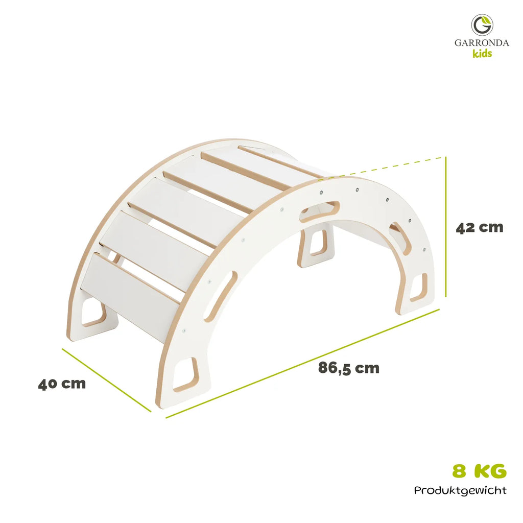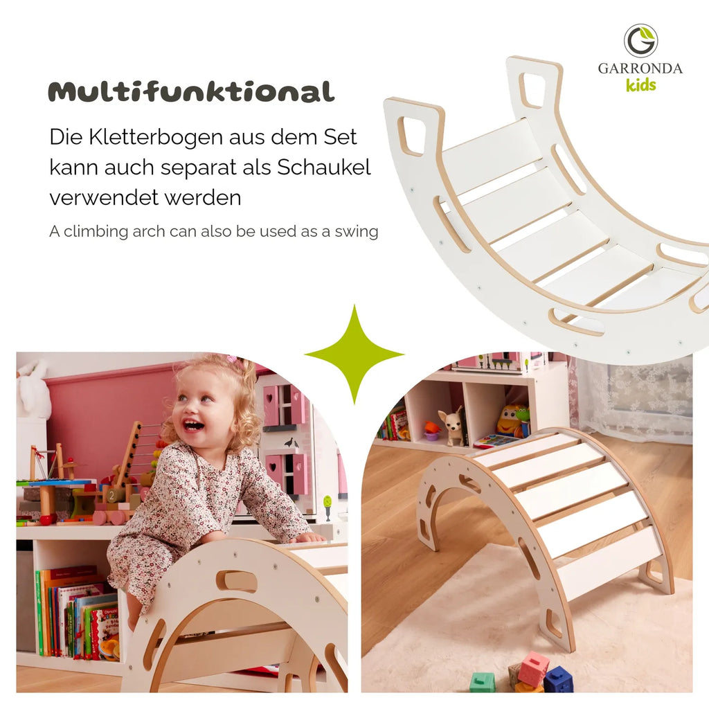 Der Garronda Montessori Kletterbogen für Kinder ist eine exzellente Wahl für die Kleinsten ab dem 1. Lebensjahr. Sie verbindet die Funktionen eines motorischen Spielzeugs und praktischen Möbelstücks für das Kinderzimmer. Mit dem Kletterbogen können Kinder ihre Kletterfähigkeiten erkunden und fördern so eine harmonische Entwicklung und Kreativität. Unterstützt von der Montessori-Philosophie. Das ist ein ideales Geburtstags- oder Weihnachtsgeschenk für kleine Entdecker.