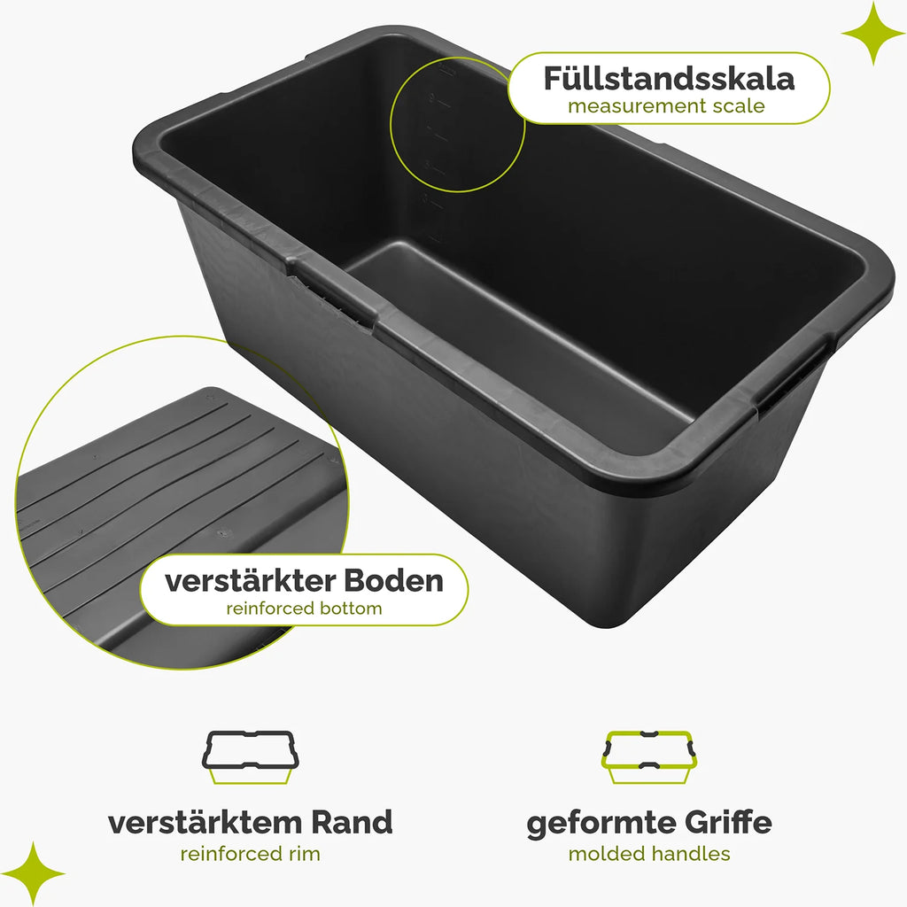 Die rechteckigen Bauwannen, Baukübel und Speisskübel bieten je nach Größe ausreichend Volumen für private und gewerbliche Anwendungen. Dank ihrer glatten Innenflächen sind sie leicht zu reinigen, stapelbar und platzsparend zu lagern.