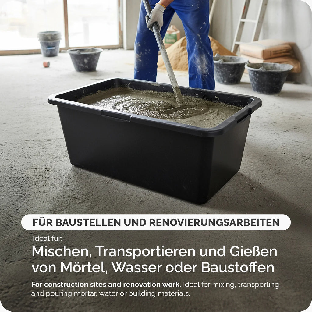 Ideal geeignet für den täglichen Gebrauch auf Baustellen, in Werkstätten, im Garten oder Haushalt. Die rechteckige Kunststoffwanne dient zum Anmischen von Mörtel, Beton und Estrich, aber auch zum Transportieren oder Lagern von Materialien, Erde, Wasser oder Schutt.