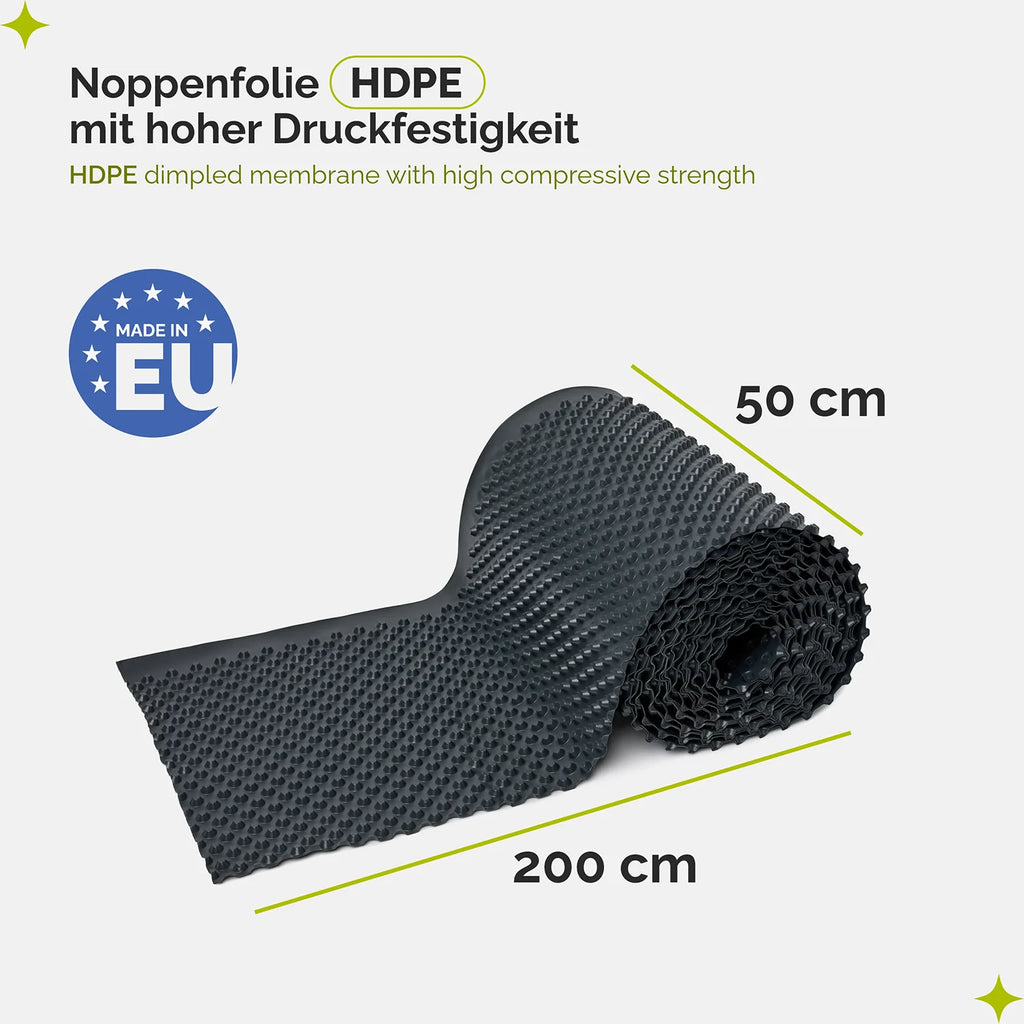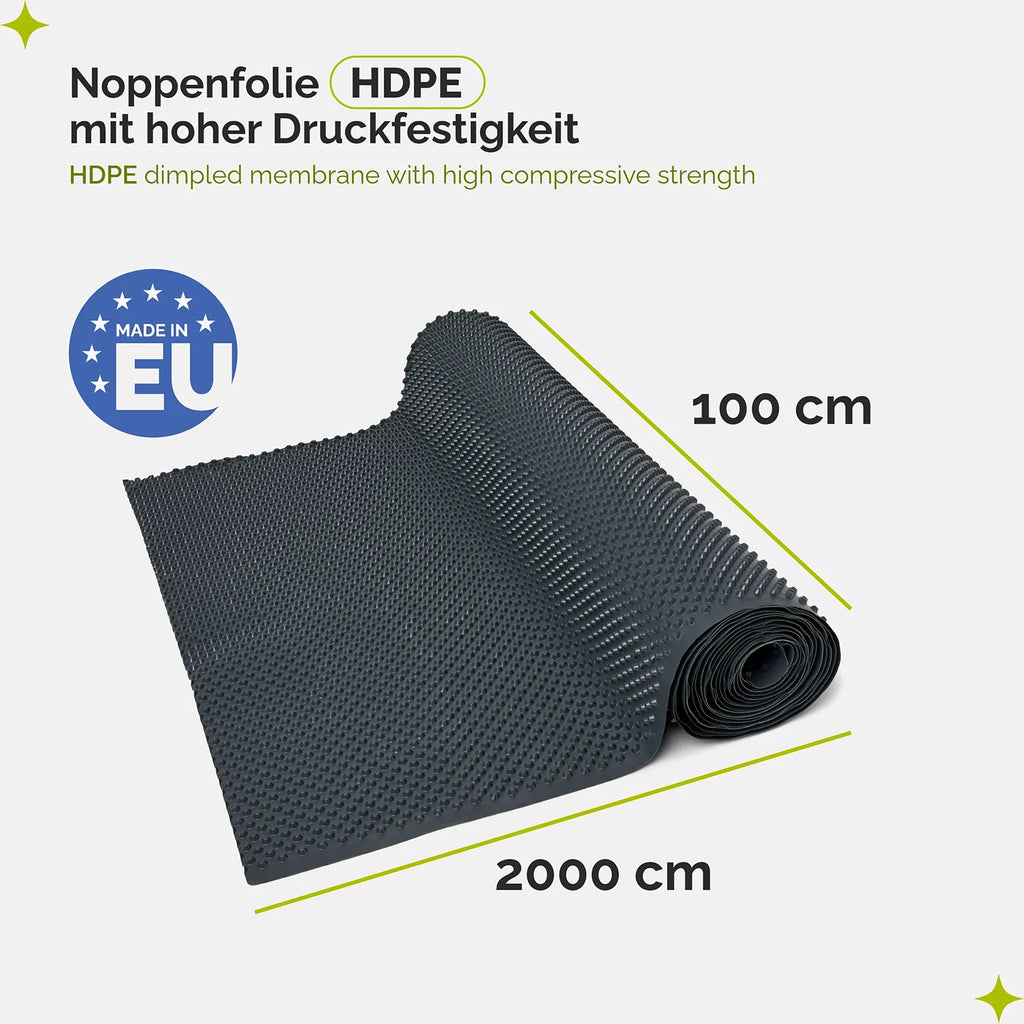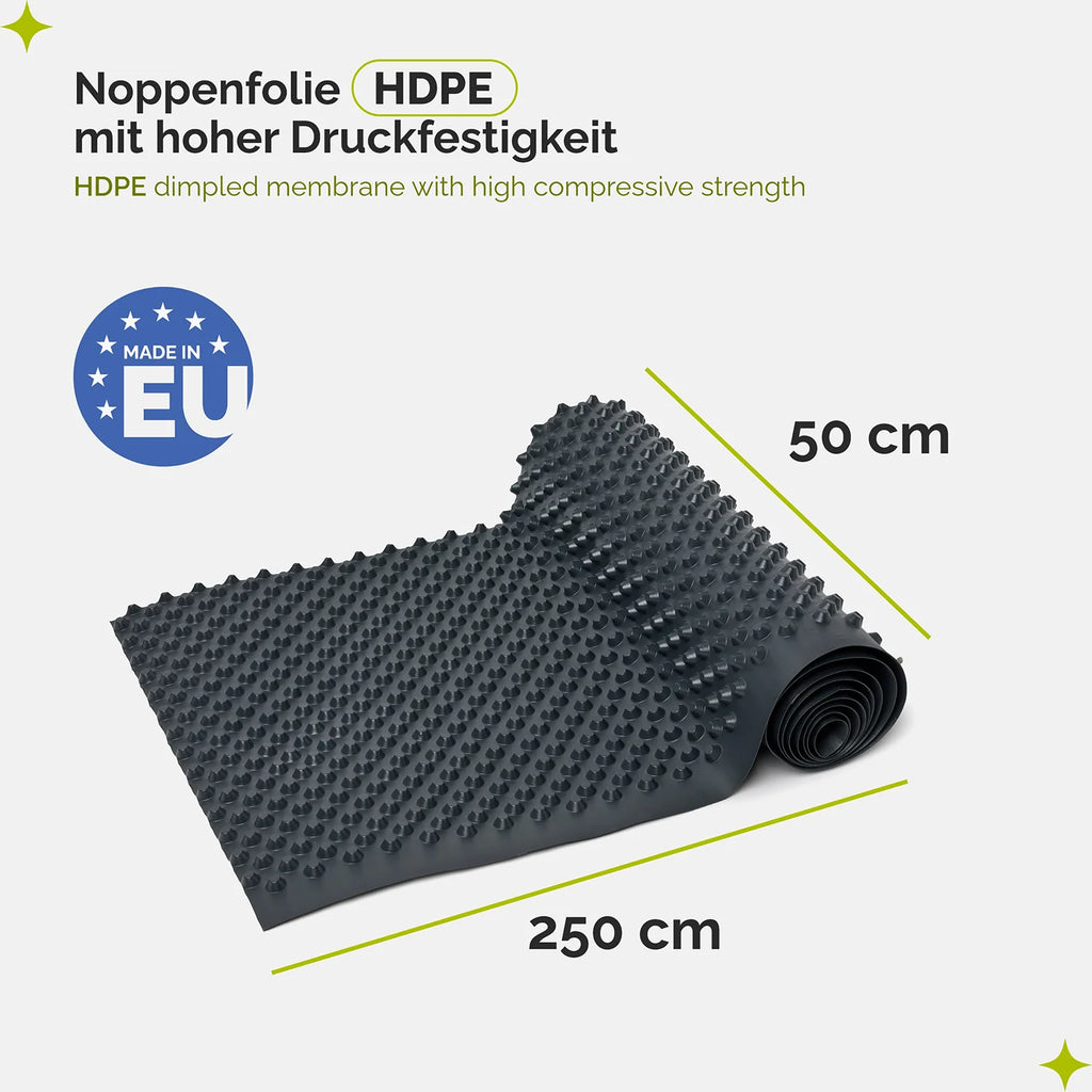 Die Garronda Noppenfolie ist die praktische Lösung für alle, die beim Hochbeet, Mauerschutz oder Bauwerksdrainage auf zuverlässigen Schutz vor Feuchtigkeit setzen möchten. Hergestellt in der EU aus hoch verdichtetem HDPE, überzeugt die Noppenbahn durch ihre hohe Druckfestigkeit, Wurzelfestigkeit und Flexibilität. Die charakteristische Noppenstruktur sorgt für eine effektive Belüftungsschicht, leitet Wasser optimal ab und schützt Mauerwerk, Holz oder Dämmmaterialien vor Staunässe. Egal, ob Sie ein Hochbeet auskleiden, eine Feuchtigkeitssperre für Kellerwände schaffen oder eine Drainagefolie verlegen: Die Garronda Noppenfolie lässt sich kinderleicht auf das gewünschte Maß zuschneiden und flexibel verlegen – selbst um Ecken und Kanten. Dank ihrer Widerstandskraft gegen Pilze, Bakterien und Chemikalien bleibt die Folie dauerhaft funktionstüchtig. Außerdem ist sie trinkwasserunbedenklich und frei von Weichmachern – ein Pluspunkt für umweltfreundliche Gartenprojekte. Erhältliche Größen: 0,5 x 2,5 m 0,5 x 20 m 1 x 10 m 1 x 20 m 1,5 x 20 m Mit Garronda entscheiden Sie sich für Qualität, die lange hält und vielseitig einsetzbar ist. Ob als Mauerschutzbahn, Bauwerksabdichtung oder Hochbeetfolie – unsere Noppenbahn ist ein Must-have für jeden, der Wert auf eine effektive Feuchtigkeitsisolierung und nachhaltigen Schutz legt. Vertrauen Sie auf Garronda und gestalten Sie Ihren Garten mit durchdachten Produkten, die Funktionalität und Qualität verbinden.