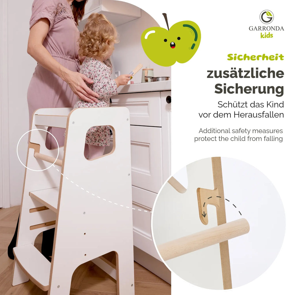 Der Garronda Kitchen Helper ist ein innovativer Küchenhelfer für Kinder ab einem Jahr, der die Funktionen eines Lernturns und eines Hockers vereint. Dadurch können Kleinkinder sicher an Küchenaktivitäten teilnehmen, ihre Motorik entwickeln und ihre Neugier fördern.