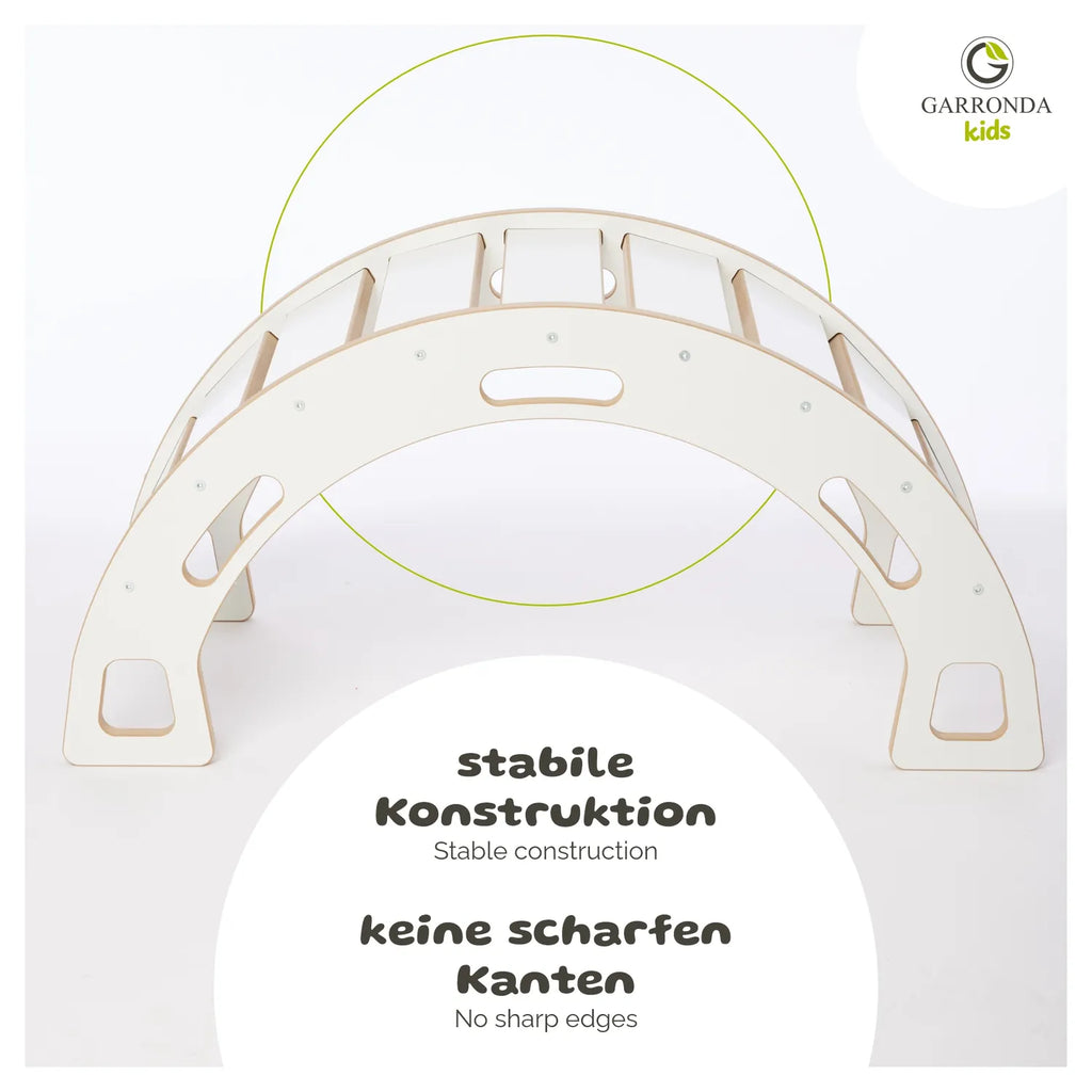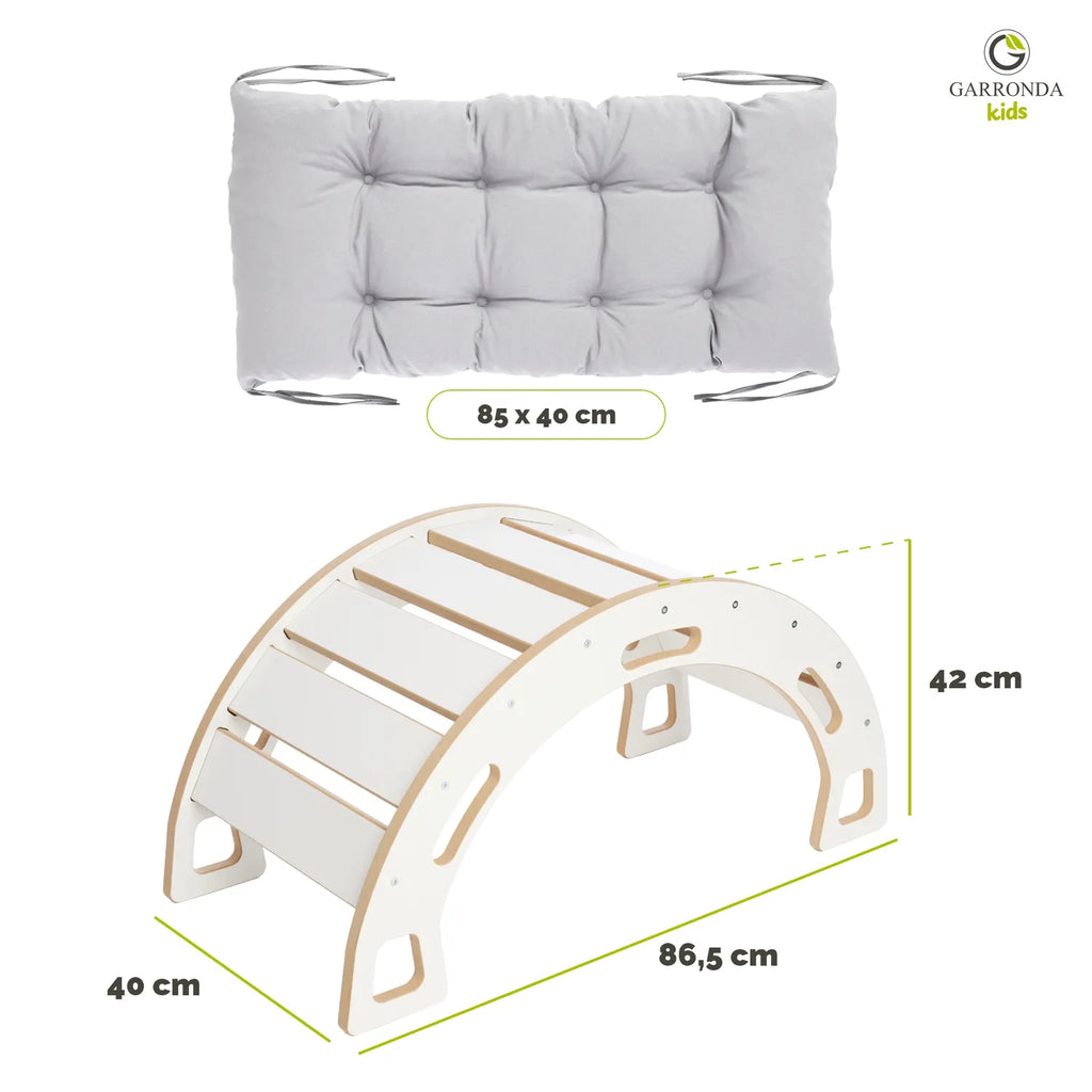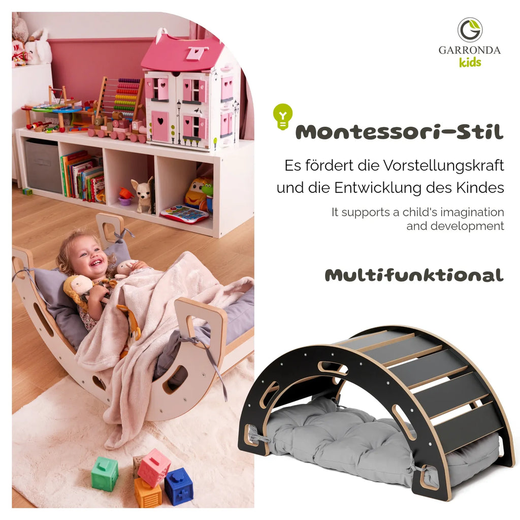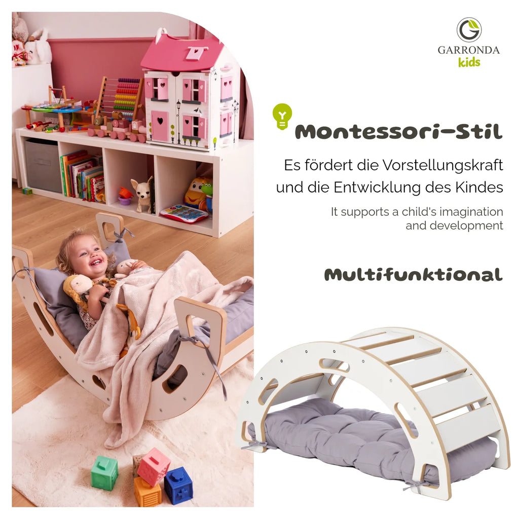 Der Garronda Kletterbogen mit Kissen Montessori für Kinder ist eine einzigartige Kombination aus einem motorischen Spielzeug ab dem 1. Lebensjahr und dem Komfort einer Wiege. Unter Nutzung des Kletterbogens können Kinder ihre Kletterfähigkeiten entwickeln, was ihre harmonische Entwicklung und Kreativität im Sinne der Montessori-Philosophie fördert. Es fügt sich perfekt als funktionales Möbelstück in die Einrichtung des Kinderzimmers ein. Es ist nicht nur ein attraktives Spielzeug, sondern auch ein wunderbares Geschenk, das Spiel und Entspannung vereint.