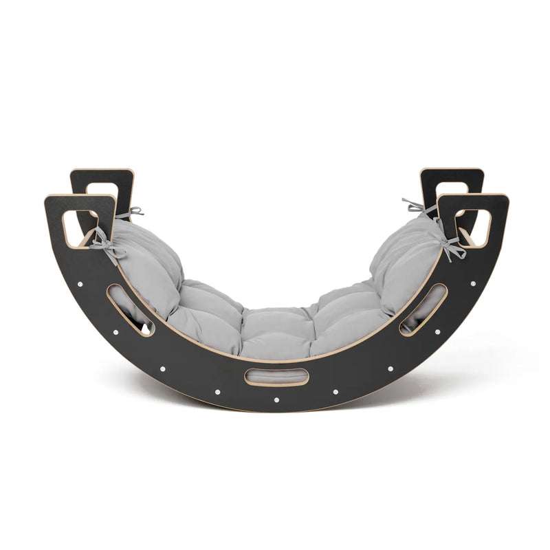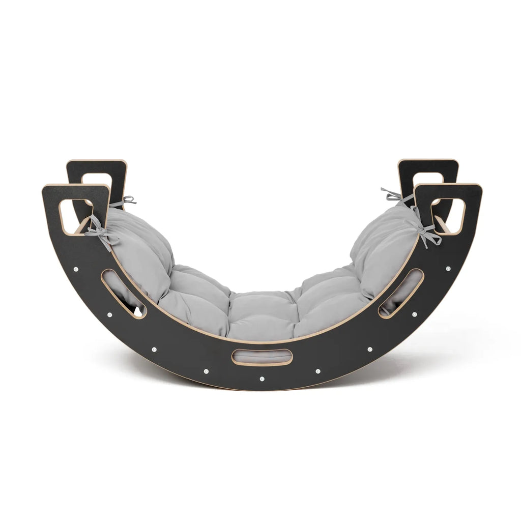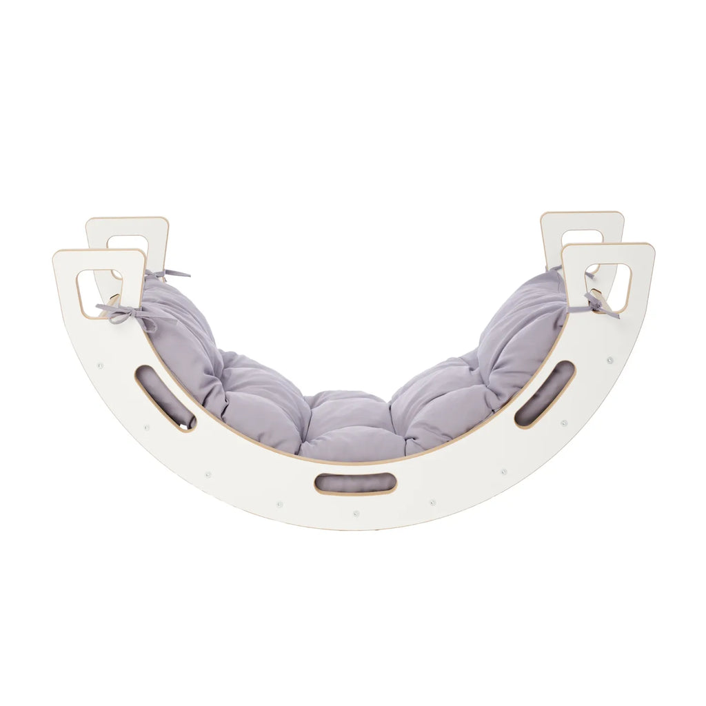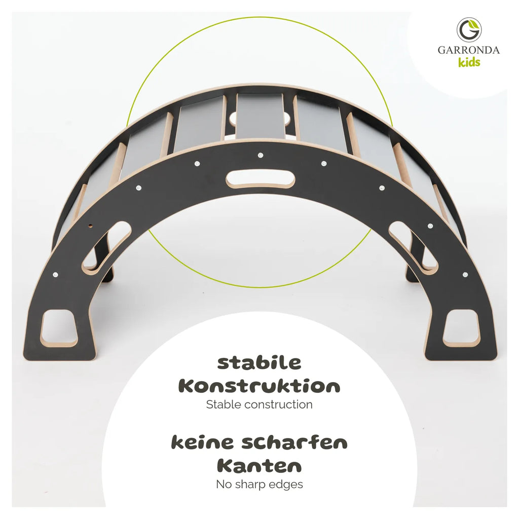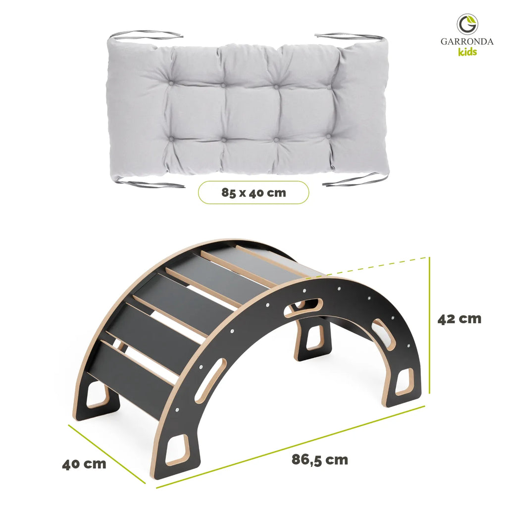 Der Garronda Kletterbogen mit Kissen Montessori für Kinder ist eine einzigartige Kombination aus einem motorischen Spielzeug ab dem 1. Lebensjahr und dem Komfort einer Wiege. Unter Nutzung des Kletterbogens können Kinder ihre Kletterfähigkeiten entwickeln, was ihre harmonische Entwicklung und Kreativität im Sinne der Montessori-Philosophie fördert. Es fügt sich perfekt als funktionales Möbelstück in die Einrichtung des Kinderzimmers ein. Es ist nicht nur ein attraktives Spielzeug, sondern auch ein wunderbares Geschenk, das Spiel und Entspannung vereint.