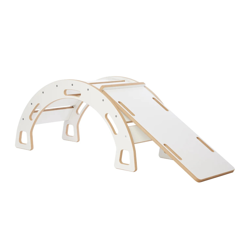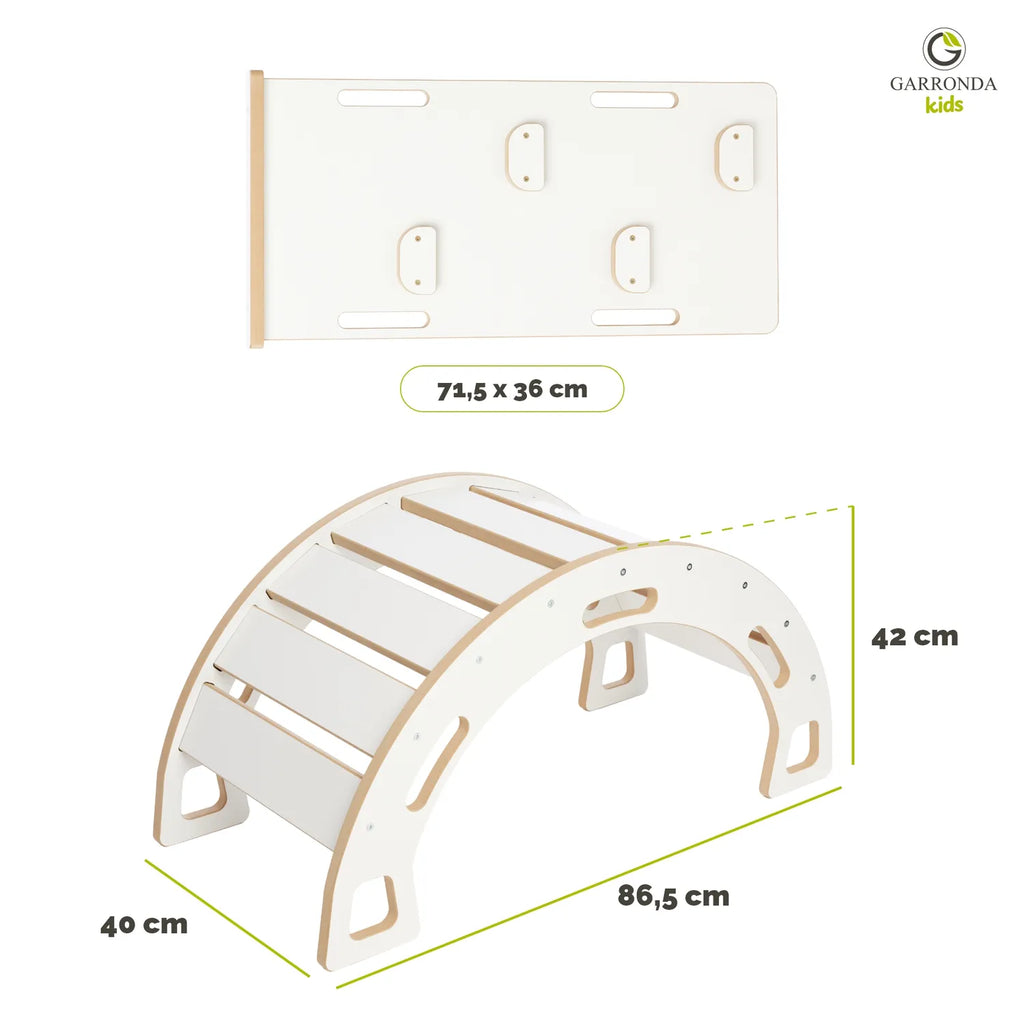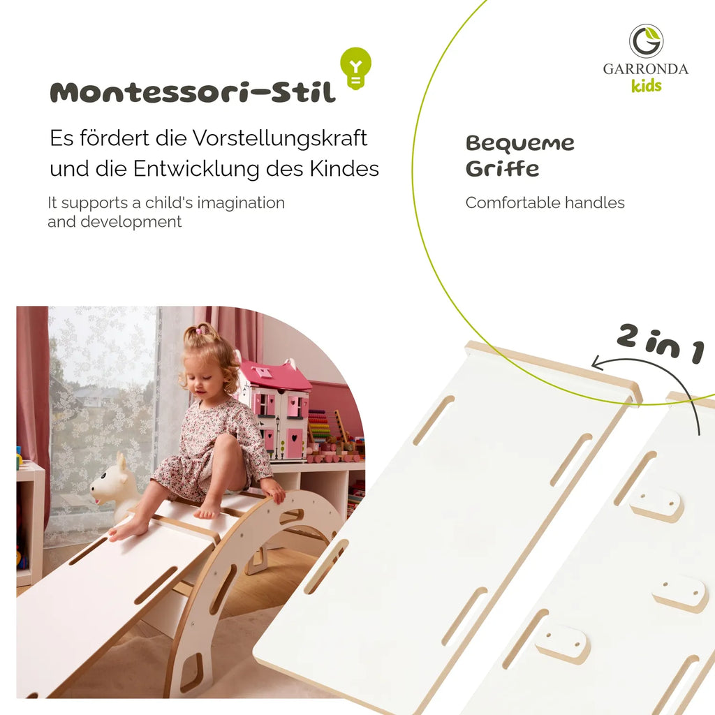 Der Garronda Montessori Kletterbogen mit Rutsche für Kinder ist eine Kombination aus Funktionalität und Spaß. Ab dem 1. Lebensjahr bietet es Kindern die Möglichkeit, Ihre motorischen Fähigkeiten beim Klettern zu entdecken, und kreativ zu entwickeln. Unterstützt von der Montessori-Idee wird es nicht nur zu einem praktischen Möbelstück im Kinderzimmer, sondern auch zu einem perfekten Geburtstags- oder Weihnachtsgeschenk. Es fördert die motorische Entwicklung der Kleinsten im Geiste der Montessori-Philosophie.