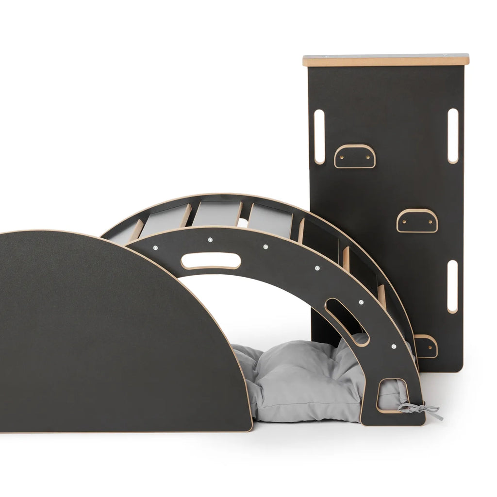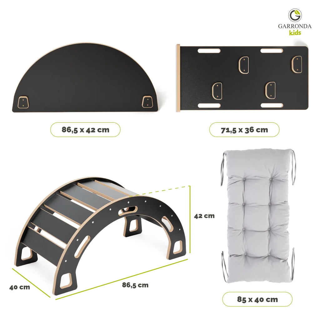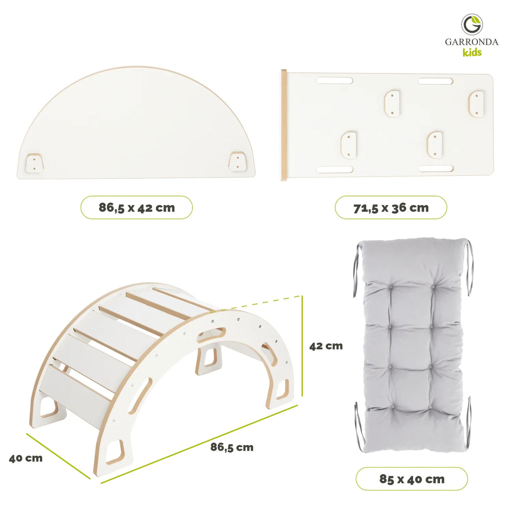 Der Garronda Kletterbogen mit Tischplatte, Kissen und Rutsche ist ein vielseitiges Montessori-Werkzeug, das Spiel und Lernen verbindet. Es ermöglicht dem Kind, motorische Fähigkeiten durch Klettern und Rutschen zu entwickeln, während es gleichzeitig als komfortabler Sitzplatz oder als kleiner Tisch dient. Durchdachte Details und Funktionalität machen es zu einer perfekten Ergänzung für jedes Kinderzimmer. Ideal als Geschenk für kleine Entdecker.