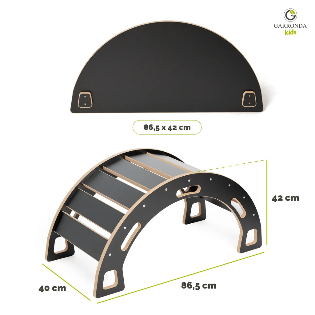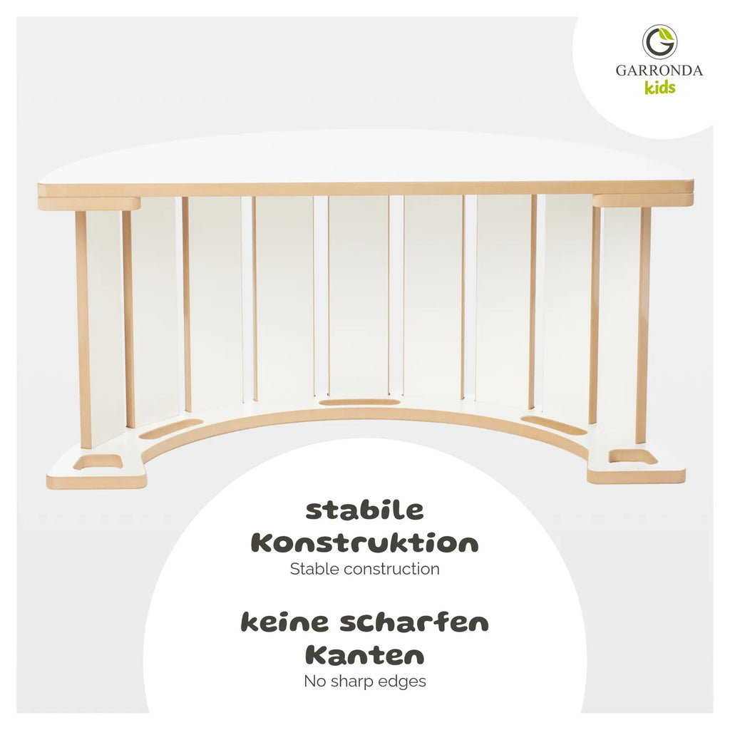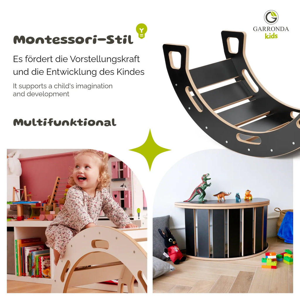 Der Garronda Kletterbogen mit Tischplatte Montessori ist nicht nur ein attraktives motorisches Spielzeug für Kinder ab einem Jahr, sondern auch ein praktischer Kindertisch. Der Kletterbogen regt Aktivität und Kreativität an und fördert die harmonische Entwicklung des Kindes gemäß den Montessori-Prinzipien. Die Tischplatte fügt Funktionalität hinzu und macht die Kletterbogen zu einem vielseitigen Möbelstück im Kinderzimmer. Perfekt als Geschenk, das Spiel und Lernen verbindet.
