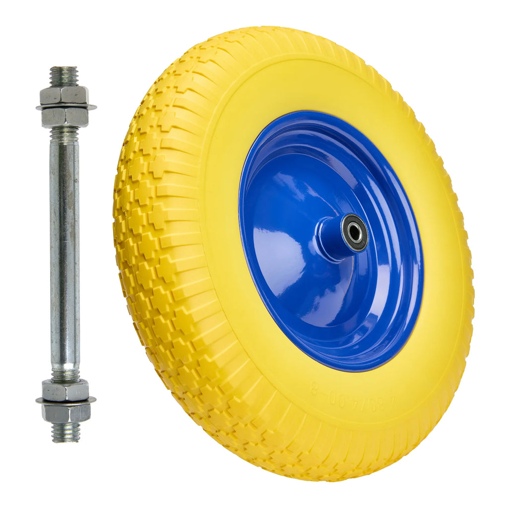 Die technischen Daten sind präzise auf gängige Schubkarren abgestimmt: Durchmesser Ø 390 mm, Breite 95 mm, Achsloch 12 mm, Nabenbreite 97 mm. Die Lieferung erfolgt inklusive Achse – damit ist das Rad sofort einsatzbereit und einfach zu montieren. Dank der standardisierten Maße eignet es sich auch perfekt als Ersatz für herkömmliche Luftreifen in den meisten handelsüblichen Schubkarren.