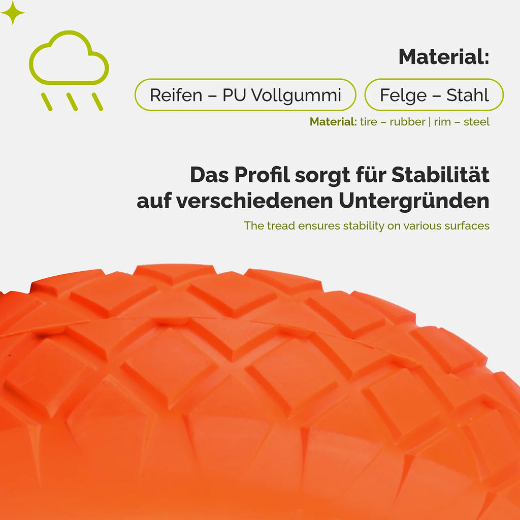Das Profil der Vollgummireifen sorgt für zuverlässigen Halt auf verschiedensten Untergründen, während die Kugellager den Rollwiderstand minimieren und ein leichtes, präzises Manövrieren ermöglichen – selbst auf langen Strecken. Ob beim Schieben über Kies, Erde oder Beton, das Rad bleibt stabil, ruhig und komfortabel in der Führung.