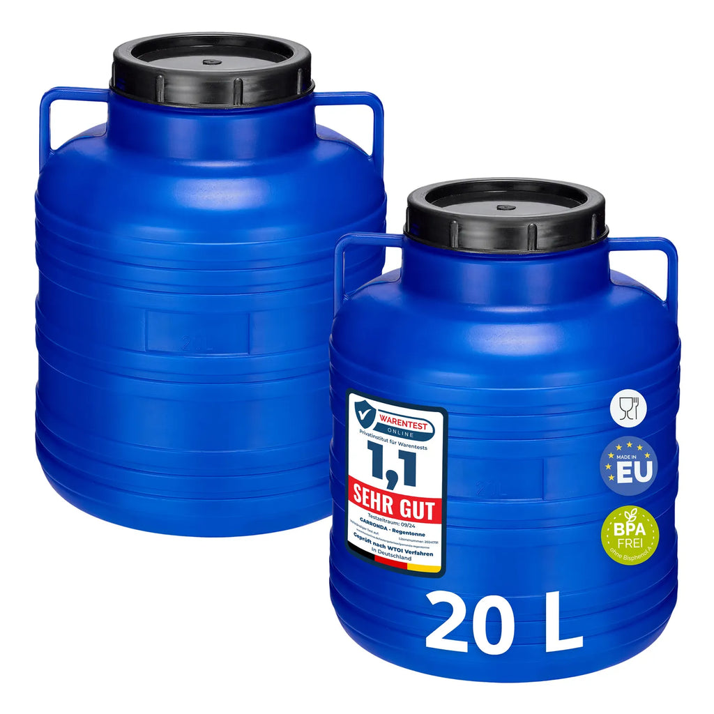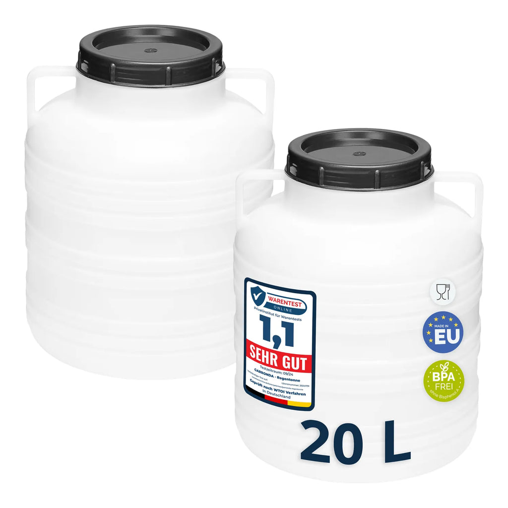 Hergestellt in der EU aus leichtem, ungiftigem HDPE, jeweils mit einem Deckel.Lieferumfang: Set aus 2 Stück Fässern 20L.