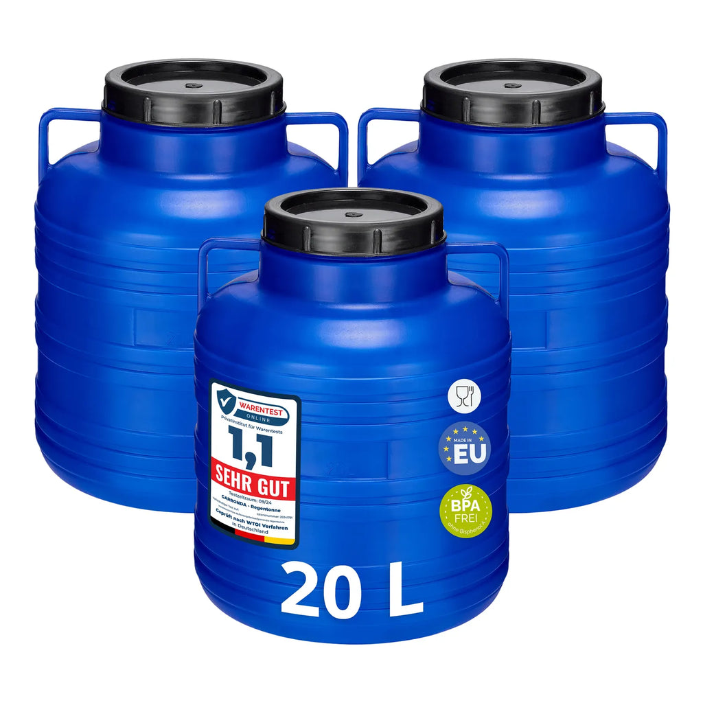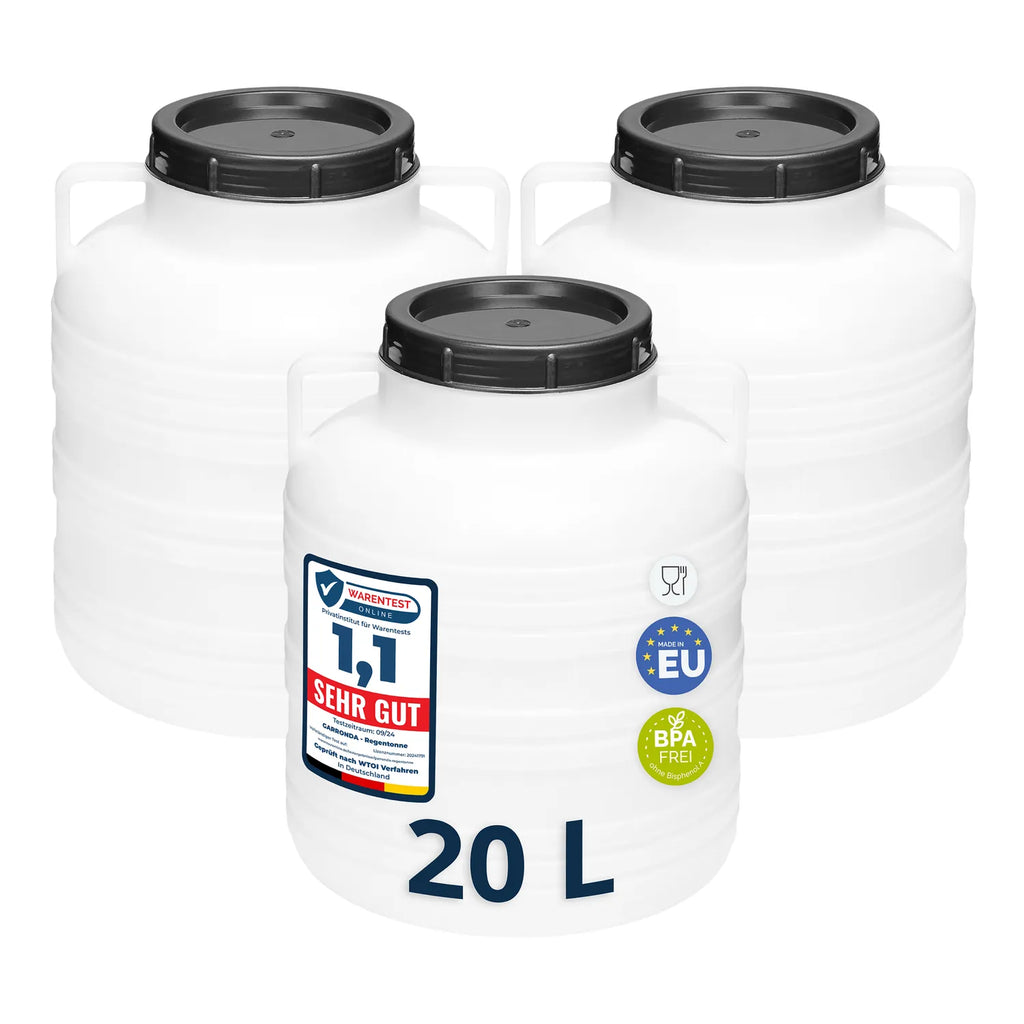 Hergestellt in der EU aus leichtem, ungiftigem HDPE, jeweils mit einem Deckel. Lieferumfang: Set aus 3 Stück Fässern 20L.