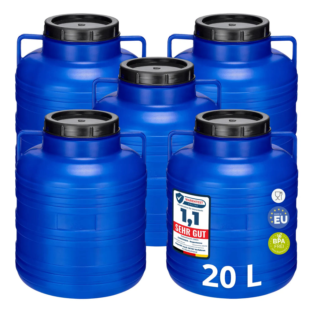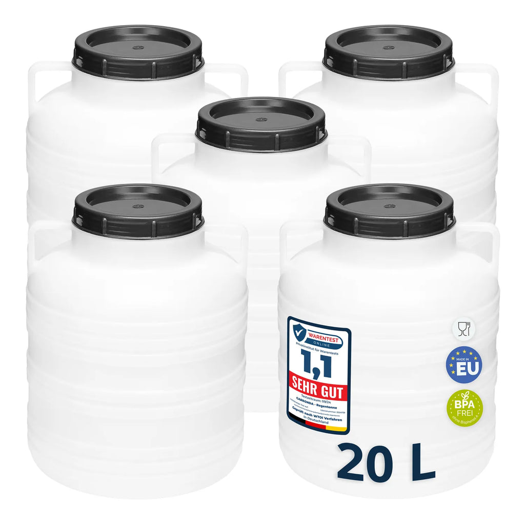 Hergestellt in der EU aus leichtem, ungiftigem HDPE, jeweils mit einem Deckel.Lieferumfang: Set aus 5 Stück Fässern 20L.