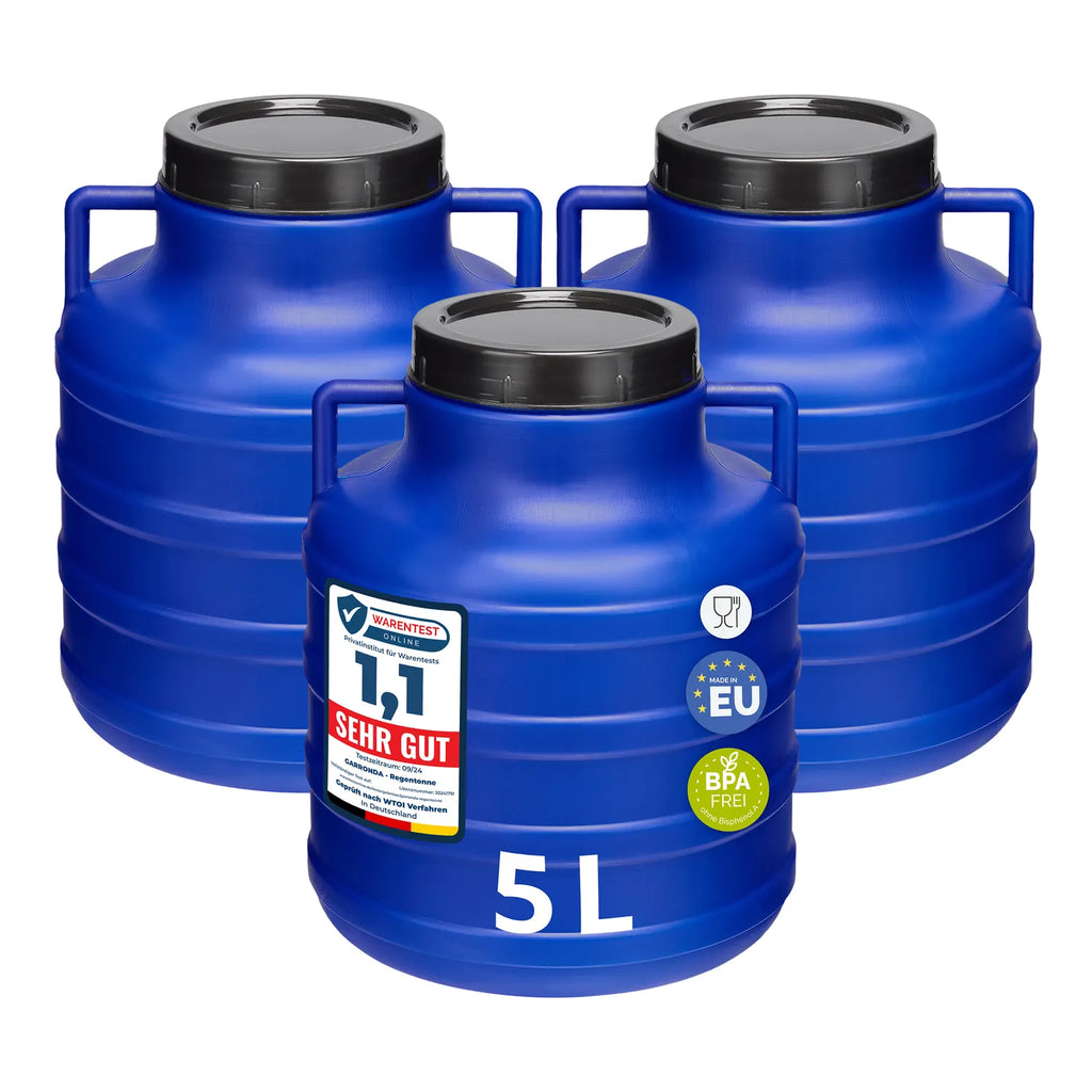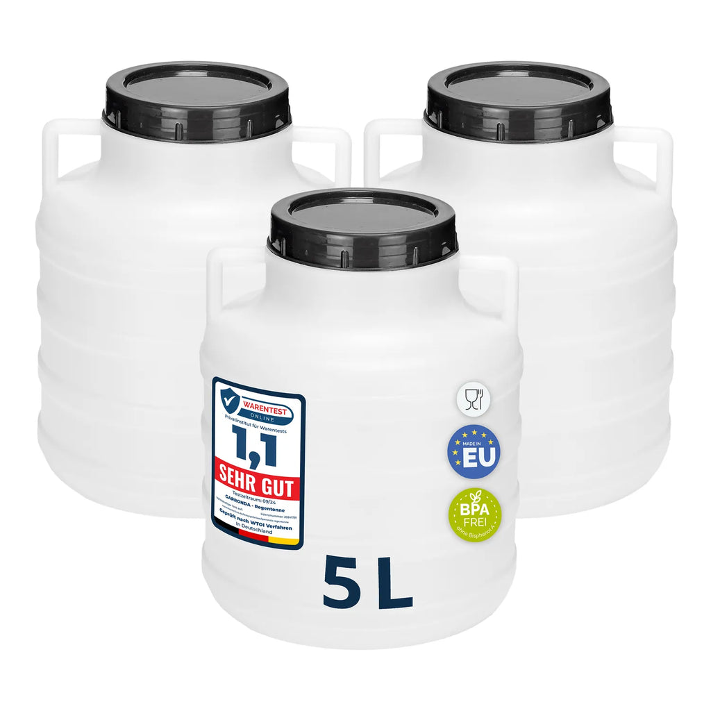 Hergestellt in der EU aus leichtem, ungiftigem HDPE, jeweils mit einem Deckel. Lieferumfang: Set aus 3 Stück Fässern 5L.