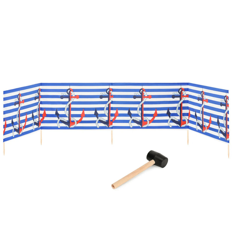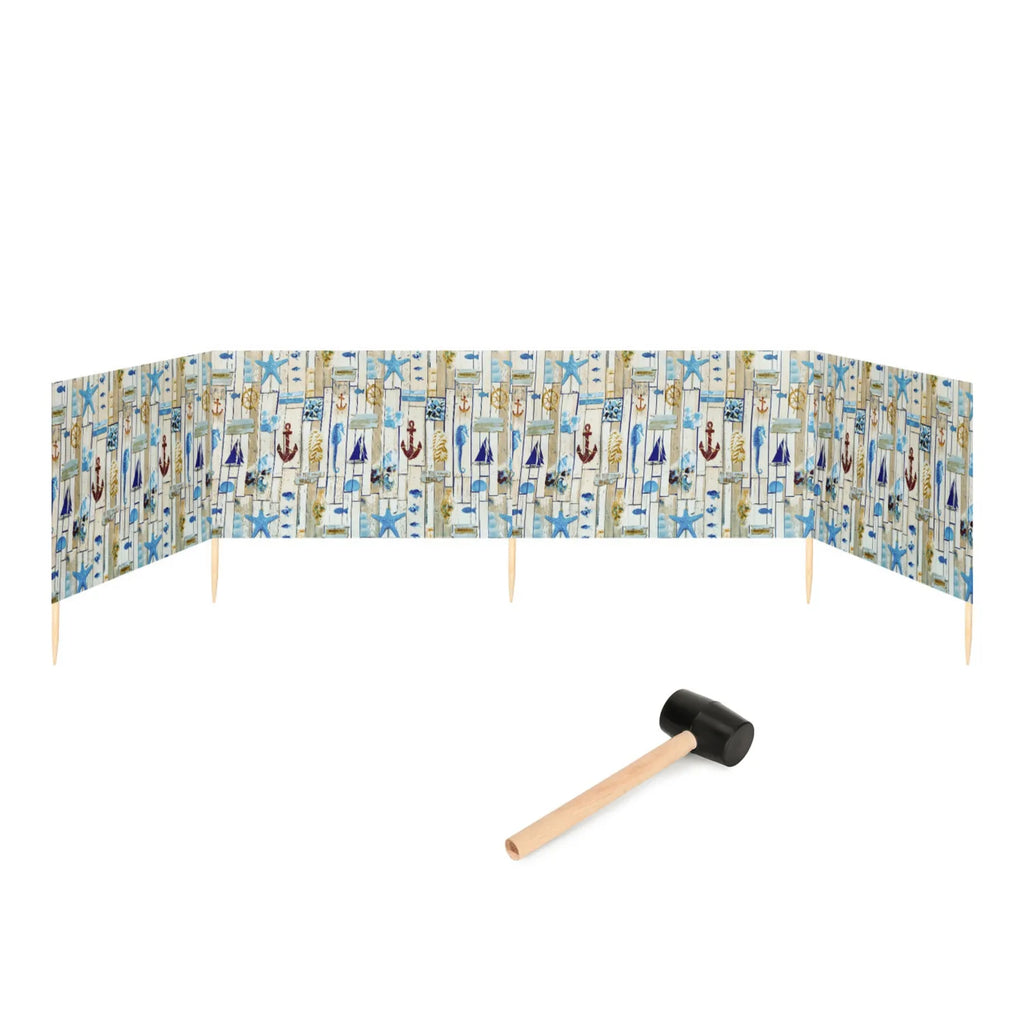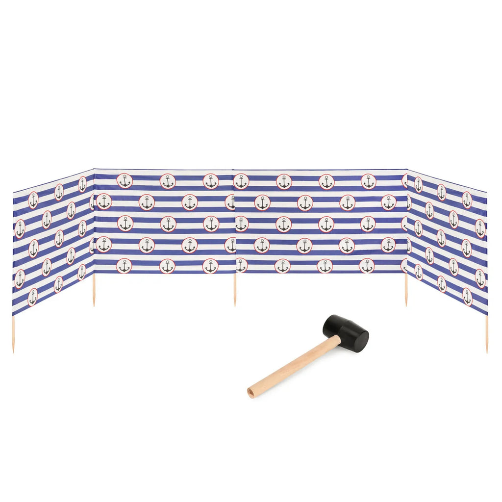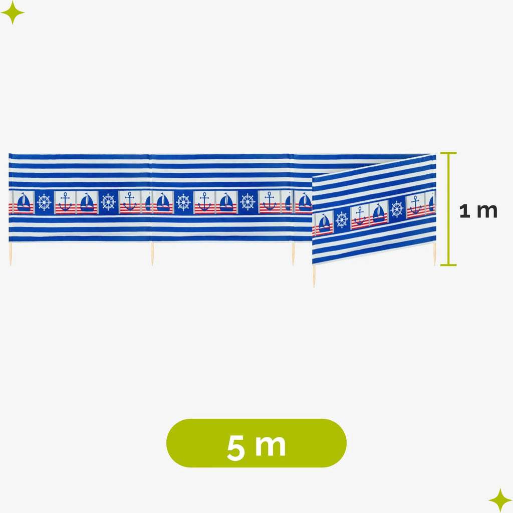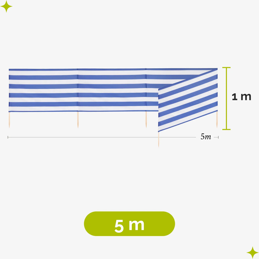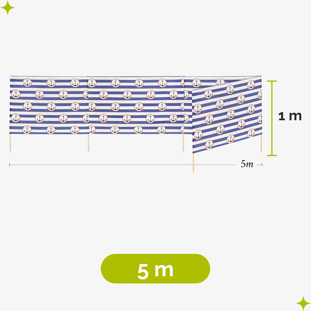 Strand Windschutz. Paravent. Unentbehrlich für jeden Strandgänger. Beim Kauf des Windschutzes erhalten Sie einen Gummihammer dazu, mit dem der Wundschutz unkompliziert im Boden befestigt werden kann. Der Strandwindschutz wurde aus starkem Material hergestellt, das auf soliden Holzstöcken angebracht wurde. Der Paravent gibt Schutz vor Wind und Sand am Strand. Außerdem ist der Paravent ein ideales Mittel, um sich ein wenig Privatsphäre am Strand zu sichern. Er schützt sehr gut vor neugierigen Blicken. Ungefähre Maße: Länge: 5 Meter; Höhe 77 cm Anzahl der Kieferstöcke: 5 Länge der Stöcke (gänzliche Höhe des Paravents): 1m Das Material des Paravents rutscht nicht von den Stöcken, da es entlang des oberen Randes vernäht wurde. Die Stöcke fallen nicht aus dem Materialtunnel, da sie mit Hilfe von Klammern befestigt wurden. Unten wurden die Stöcke gespitzt, was beim Einstecken in den Sand hilfreich ist.
