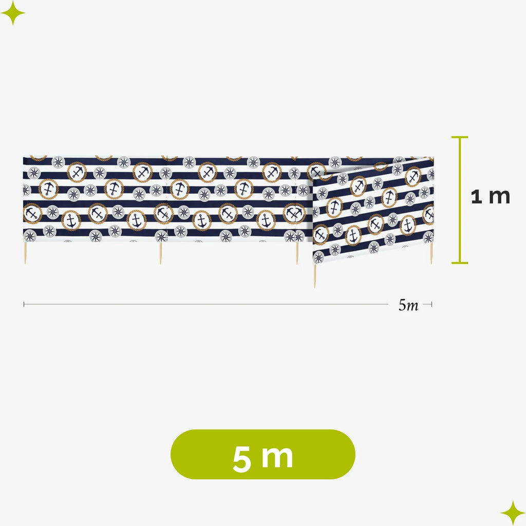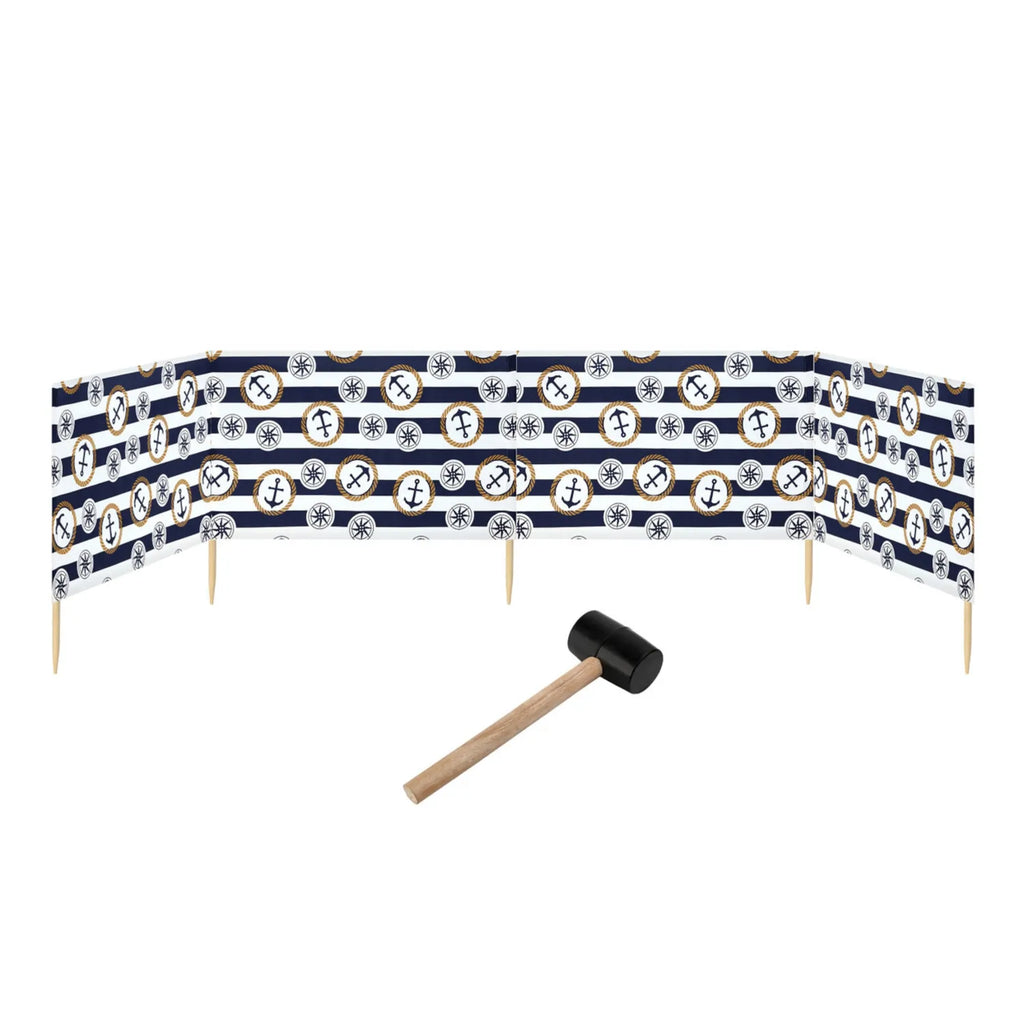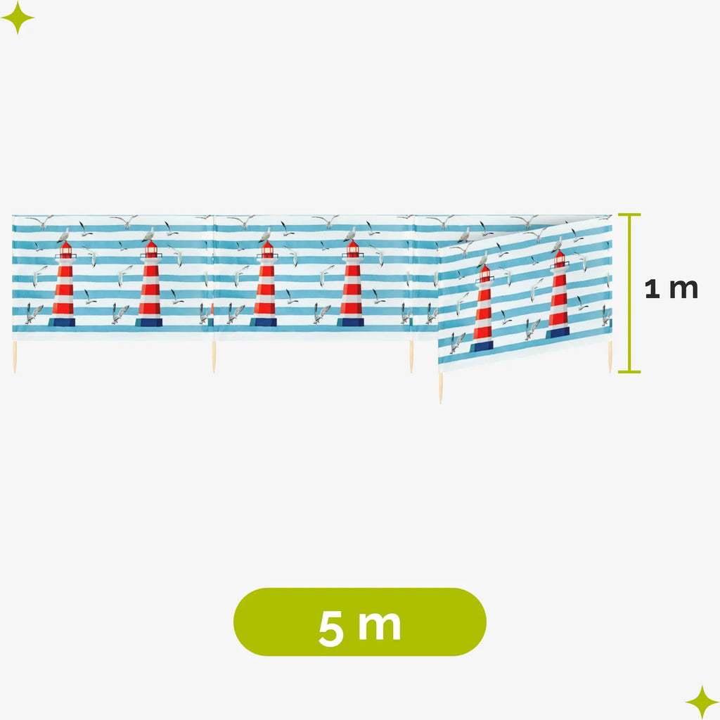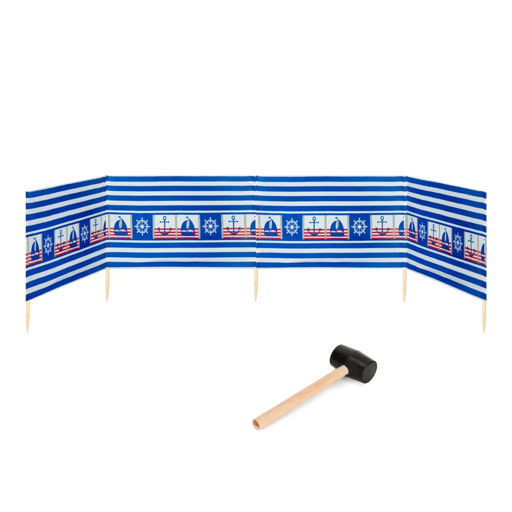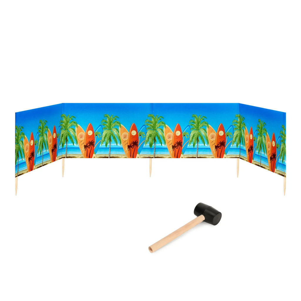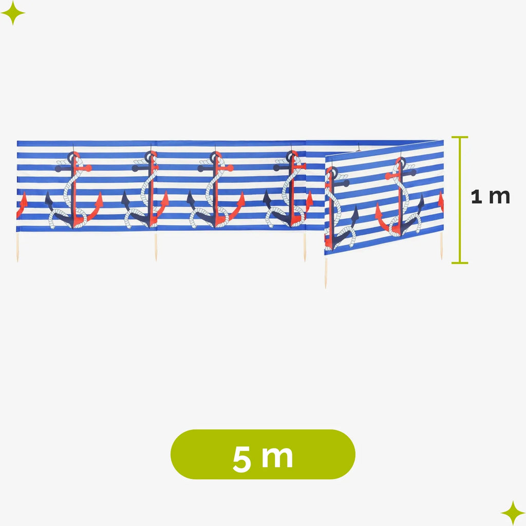 Strand Windschutz. Paravent. Unentbehrlich für jeden Strandgänger. Beim Kauf des Windschutzes erhalten Sie einen Gummihammer dazu, mit dem der Wundschutz unkompliziert im Boden befestigt werden kann. Der Strandwindschutz wurde aus starkem Material hergestellt, das auf soliden Holzstöcken angebracht wurde. Der Paravent gibt Schutz vor Wind und Sand am Strand. Außerdem ist der Paravent ein ideales Mittel, um sich ein wenig Privatsphäre am Strand zu sichern. Er schützt sehr gut vor neugierigen Blicken. Ungefähre Maße: Länge: 5 Meter; Höhe 77 cm Anzahl der Kieferstöcke: 5 Länge der Stöcke (gänzliche Höhe des Paravents): 1m Das Material des Paravents rutscht nicht von den Stöcken, da es entlang des oberen Randes vernäht wurde. Die Stöcke fallen nicht aus dem Materialtunnel, da sie mit Hilfe von Klammern befestigt wurden. Unten wurden die Stöcke gespitzt, was beim Einstecken in den Sand hilfreich ist.
