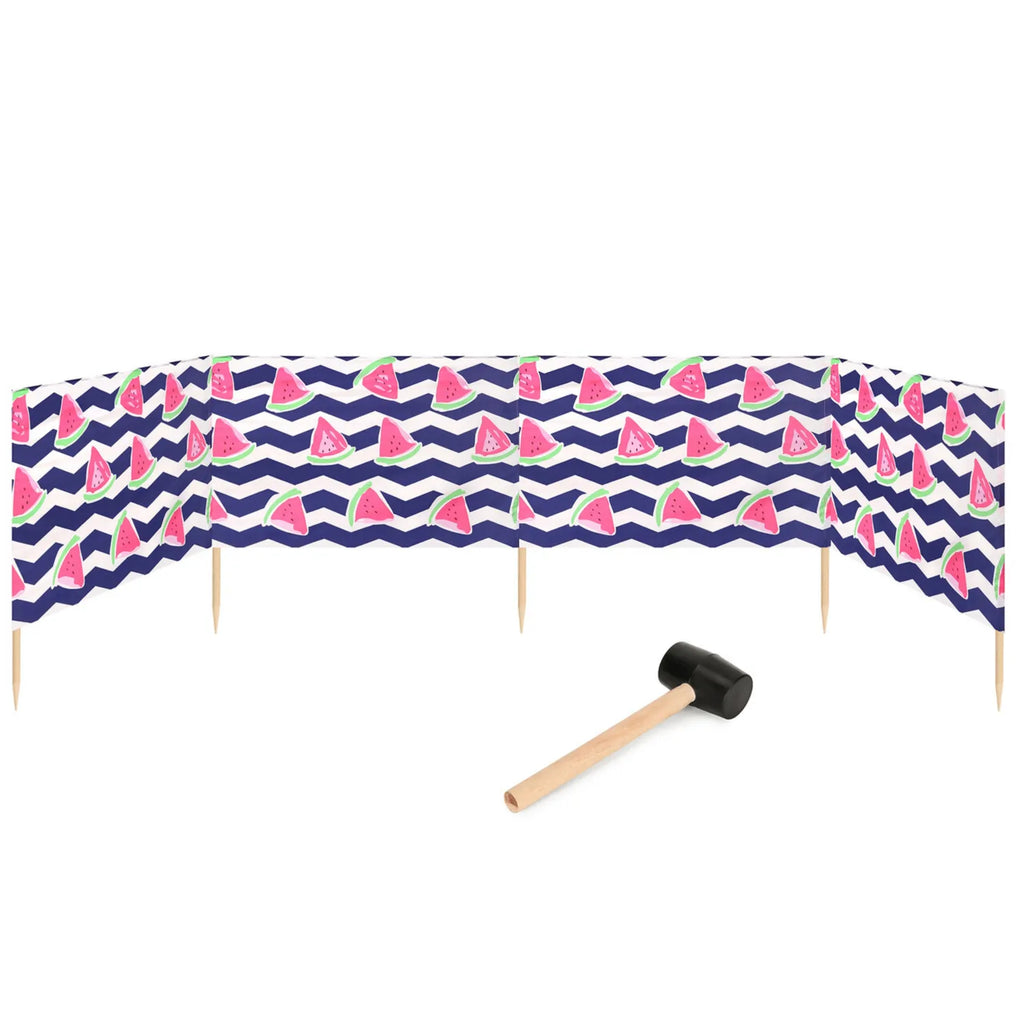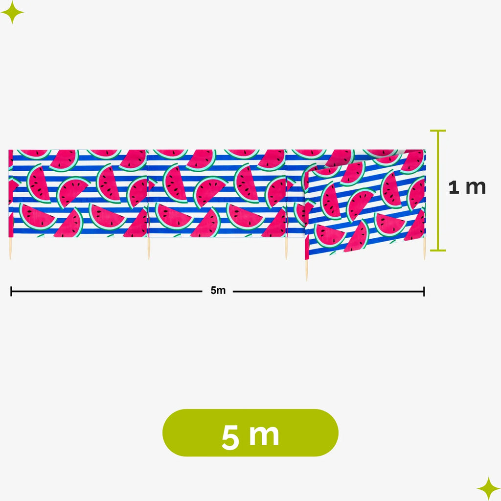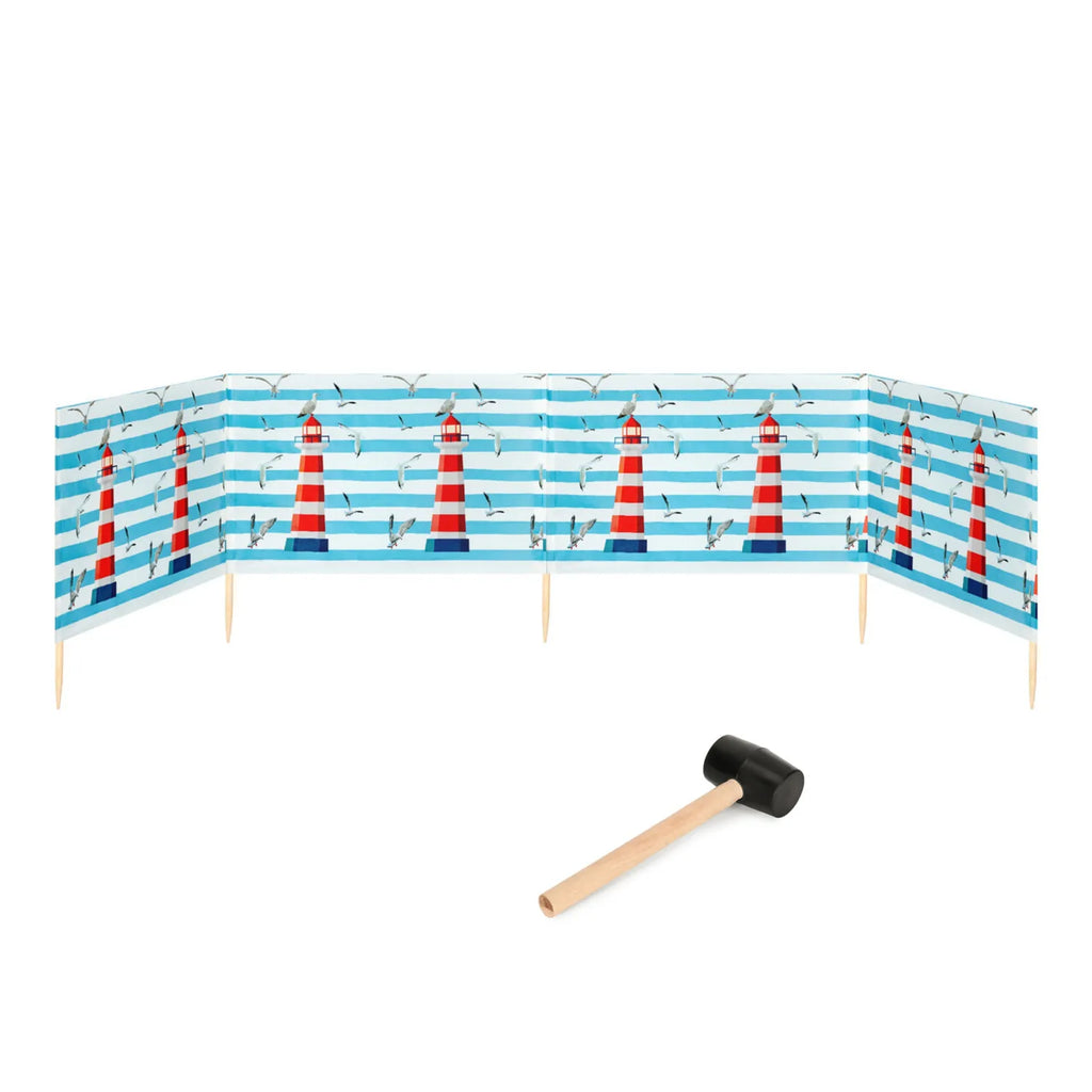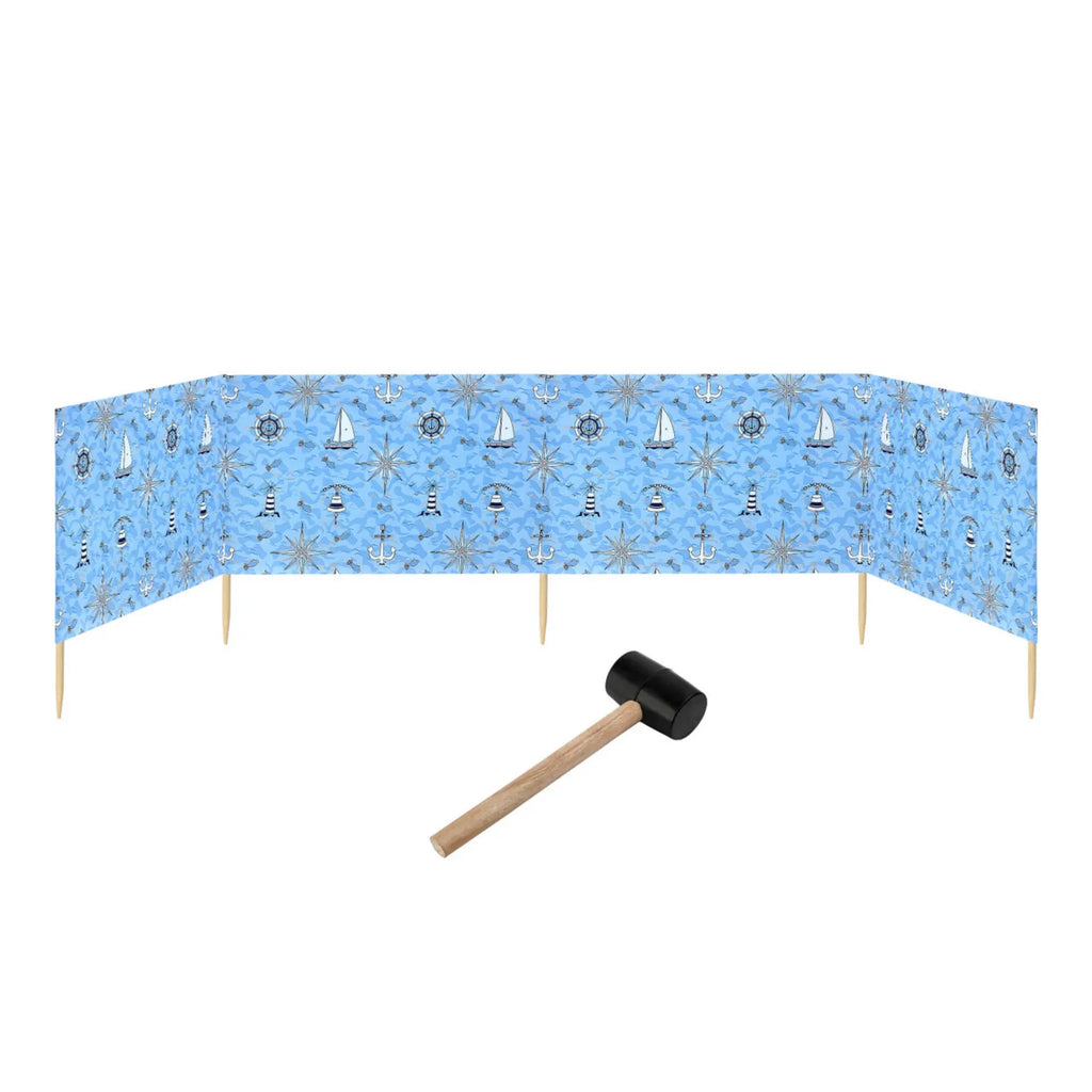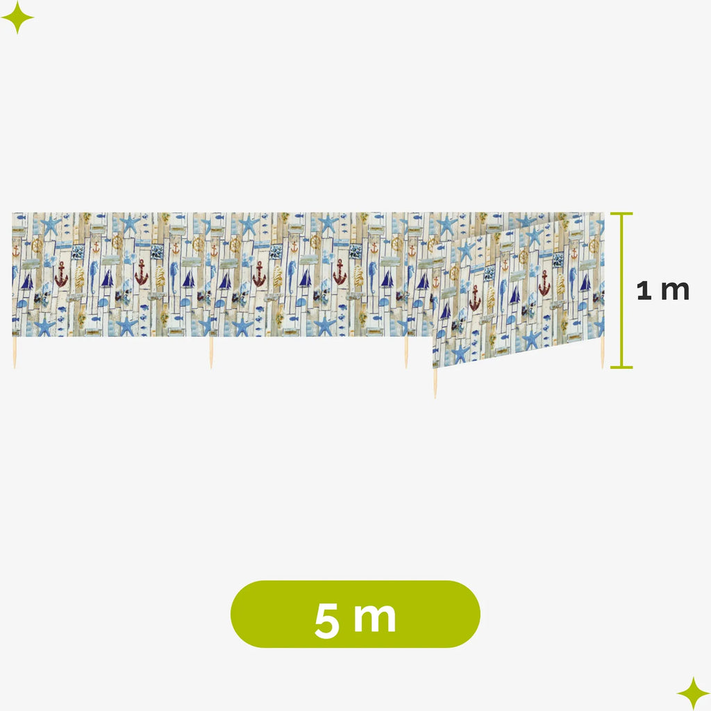 Strand Windschutz. Paravent. Unentbehrlich für jeden Strandgänger. Beim Kauf des Windschutzes erhalten Sie einen Gummihammer dazu, mit dem der Wundschutz unkompliziert im Boden befestigt werden kann. Der Strandwindschutz wurde aus starkem Material hergestellt, das auf soliden Holzstöcken angebracht wurde. Der Paravent gibt Schutz vor Wind und Sand am Strand. Außerdem ist der Paravent ein ideales Mittel, um sich ein wenig Privatsphäre am Strand zu sichern. Er schützt sehr gut vor neugierigen Blicken. Ungefähre Maße: Länge: 5 Meter; Höhe 77 cm Anzahl der Kieferstöcke: 5 Länge der Stöcke (gänzliche Höhe des Paravents): 1m Das Material des Paravents rutscht nicht von den Stöcken, da es entlang des oberen Randes vernäht wurde. Die Stöcke fallen nicht aus dem Materialtunnel, da sie mit Hilfe von Klammern befestigt wurden. Unten wurden die Stöcke gespitzt, was beim Einstecken in den Sand hilfreich ist.